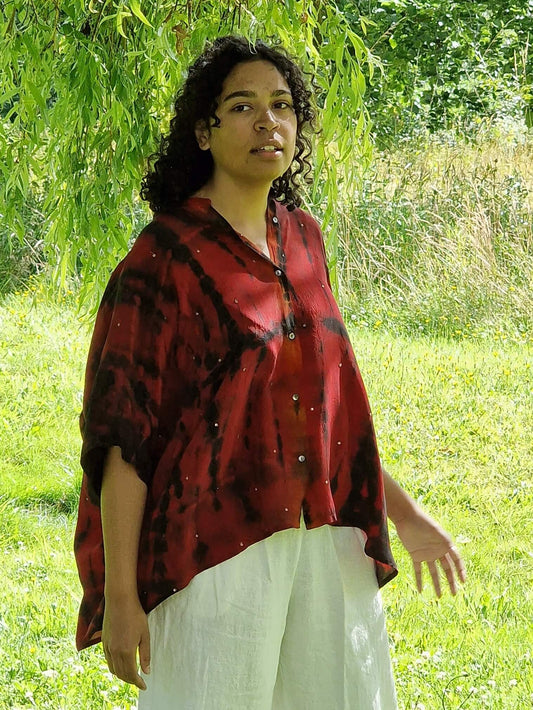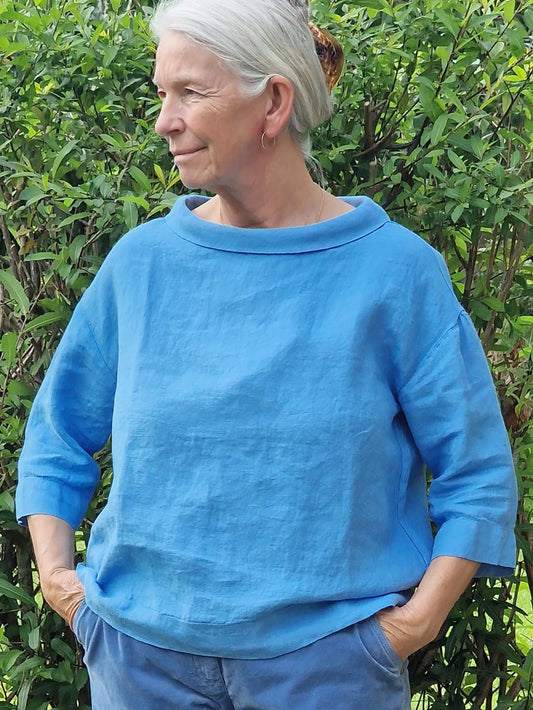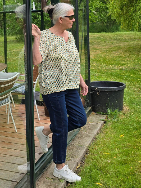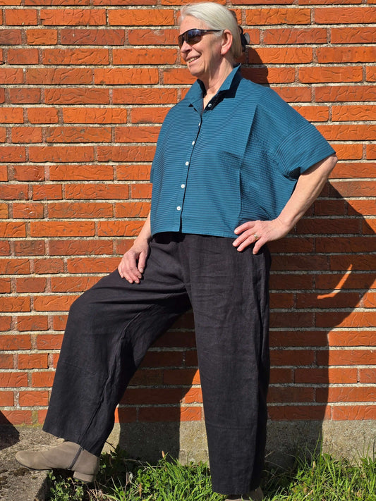 Kort bluse i turkis/karrygul printet hør. SPAR 50%
