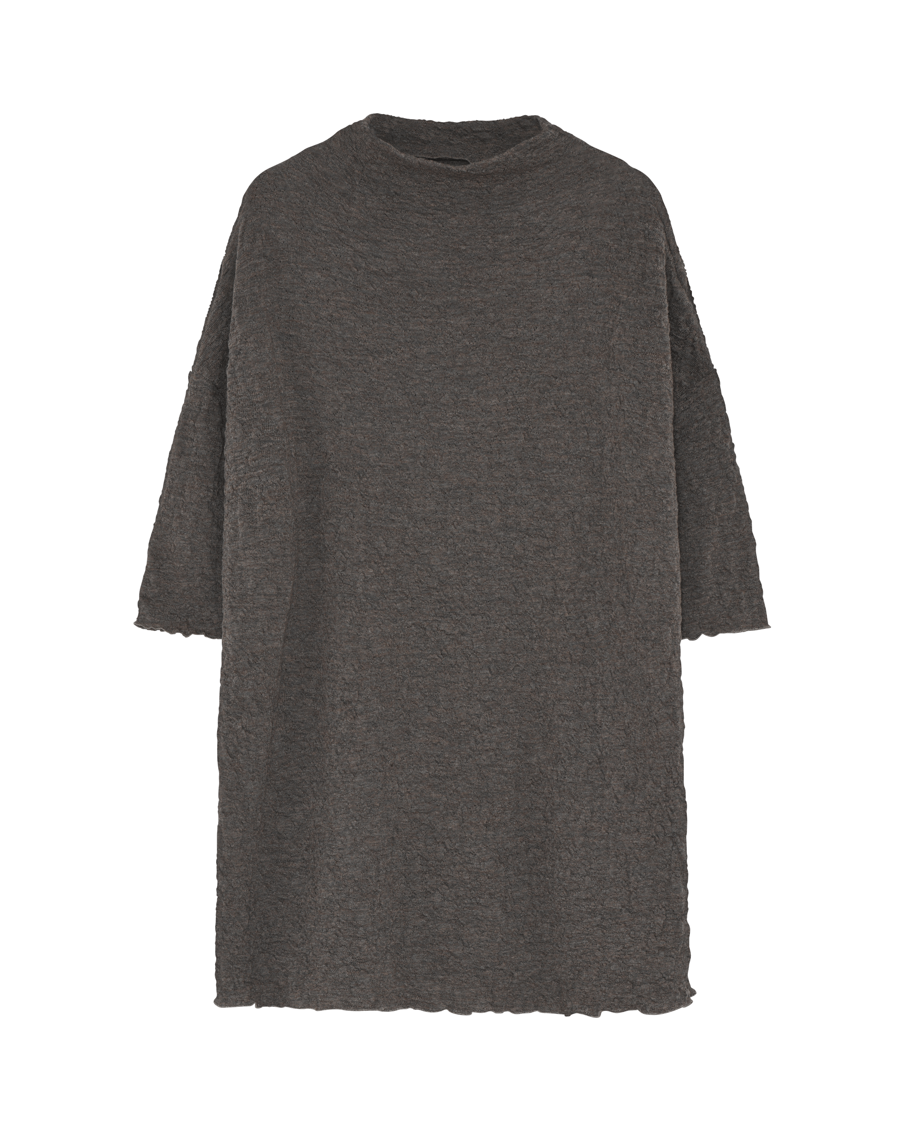 Kjolen er strikket i 100% Merino uld i et 3D mønster der ligner bobler. En meget tidløs og elegant kjole der både er flot over bukser og til strømpebukser og lange støvler.