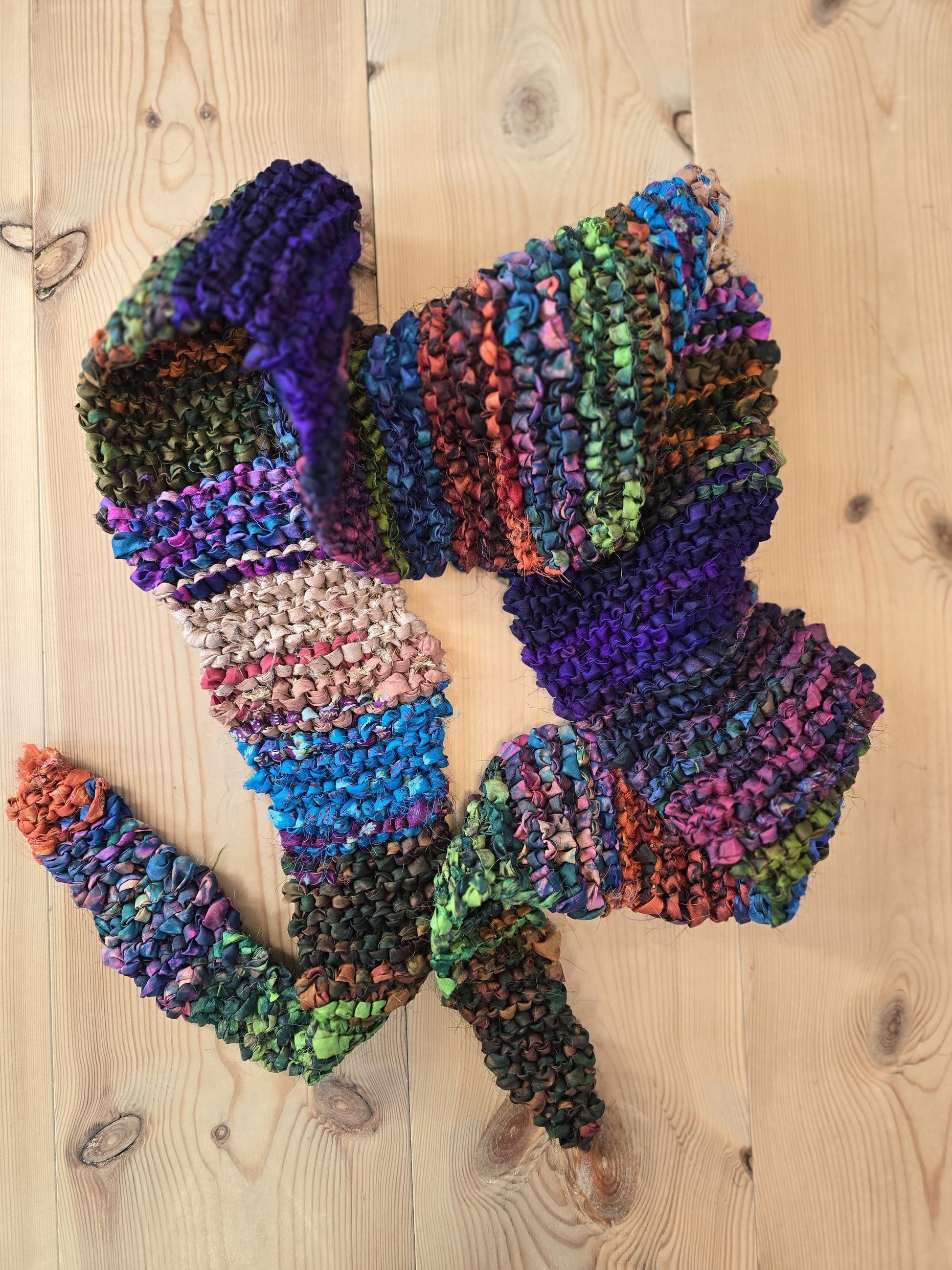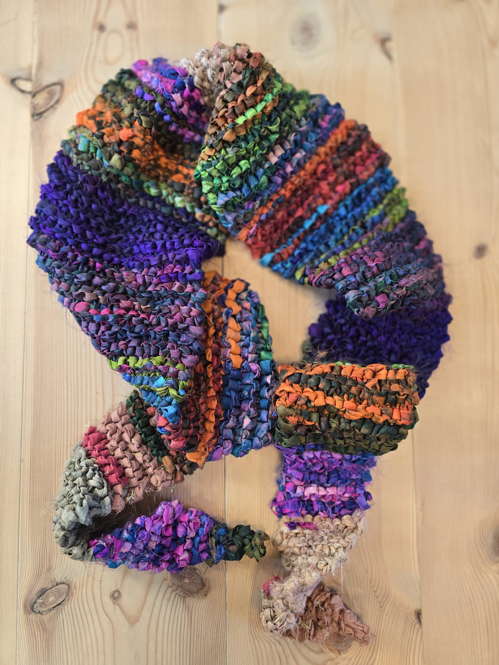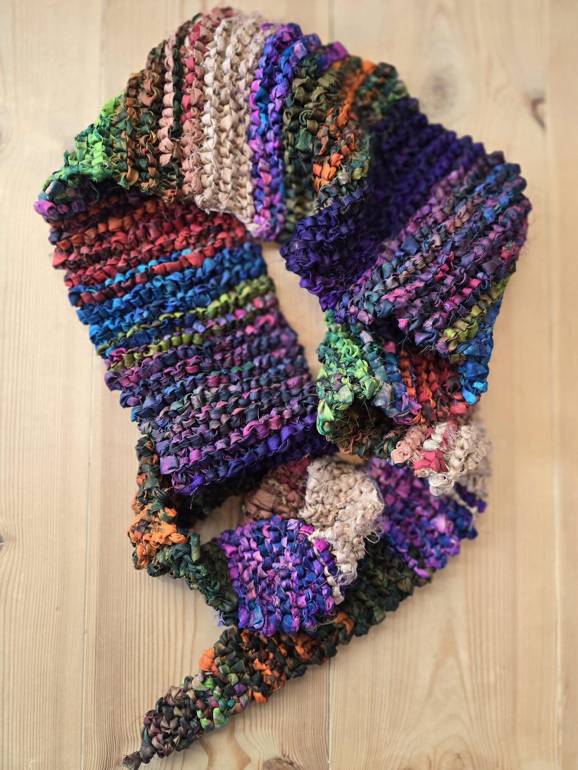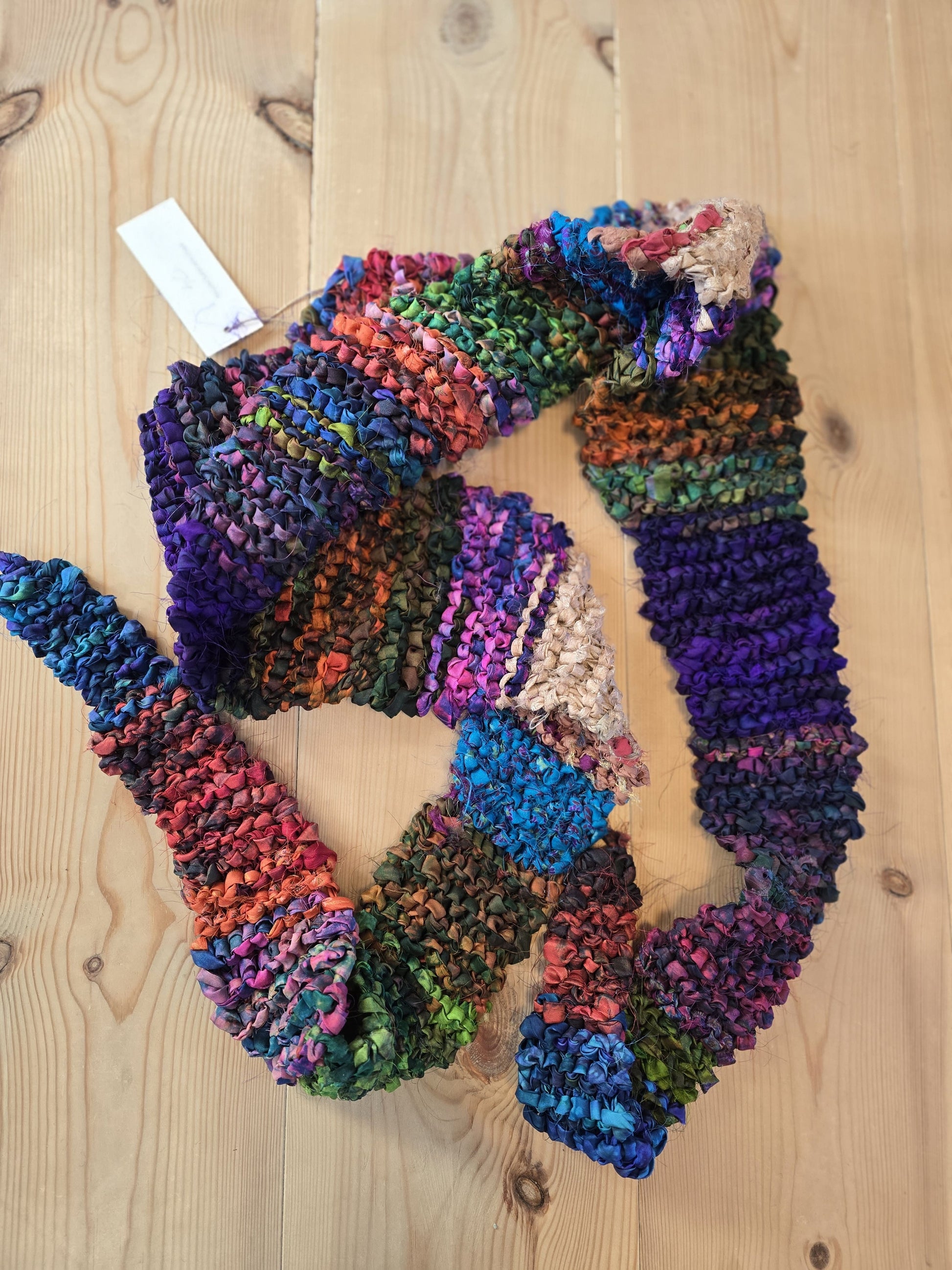 Disse tørklæder er håndstrikkede af strimler af silkestof. Stoffet er blevet til overs efter at silken er upcycled til andet tøj.