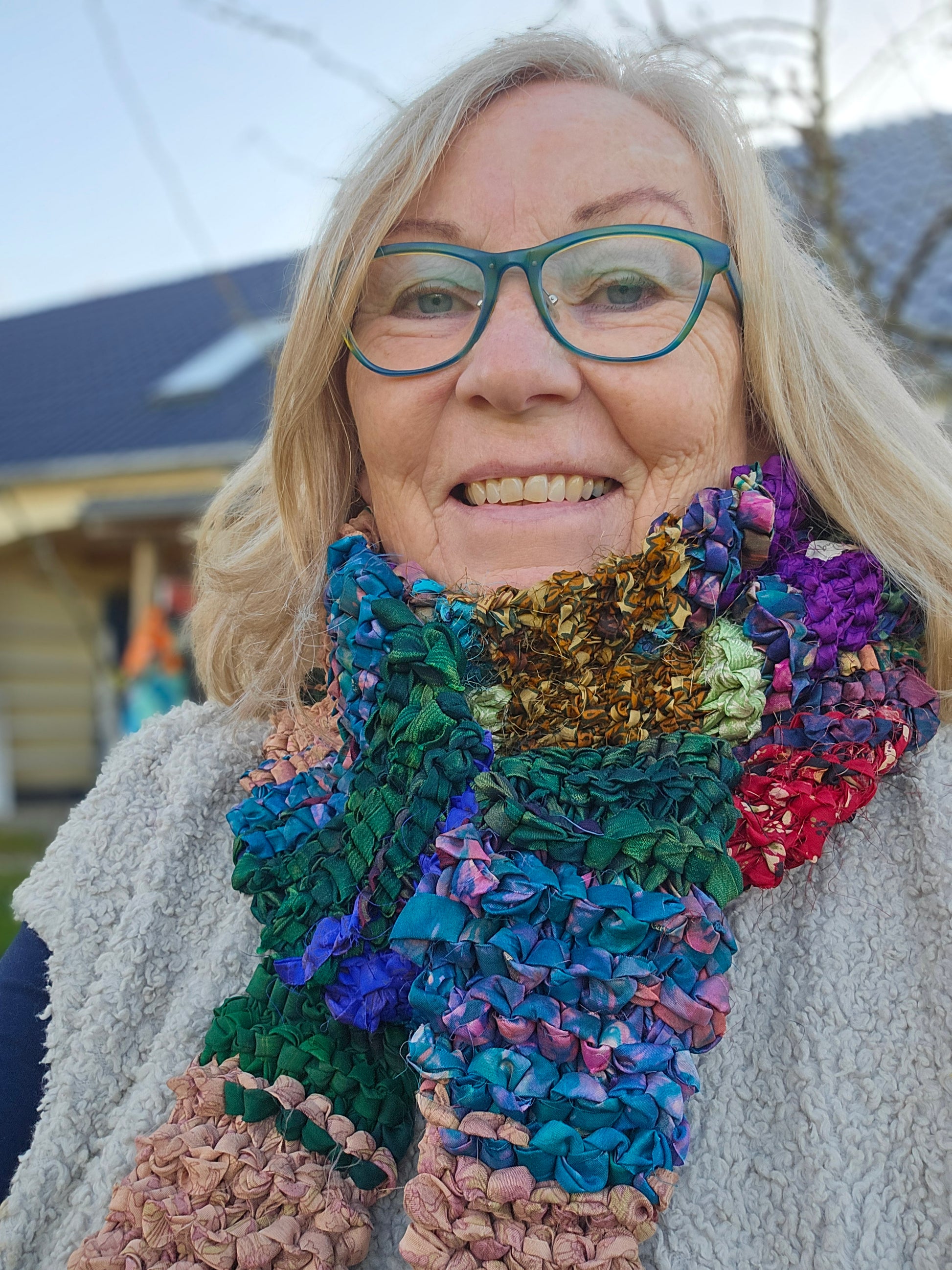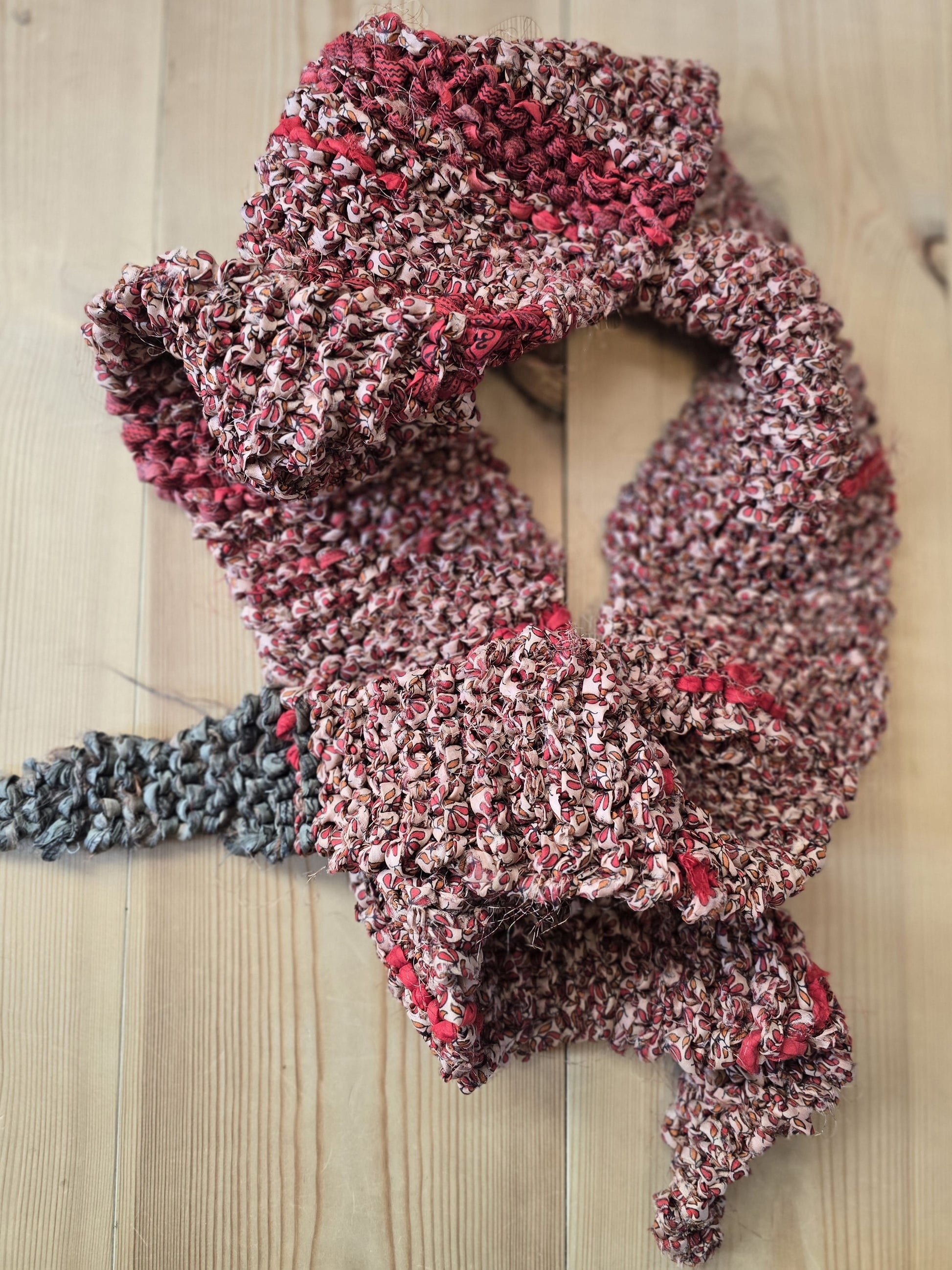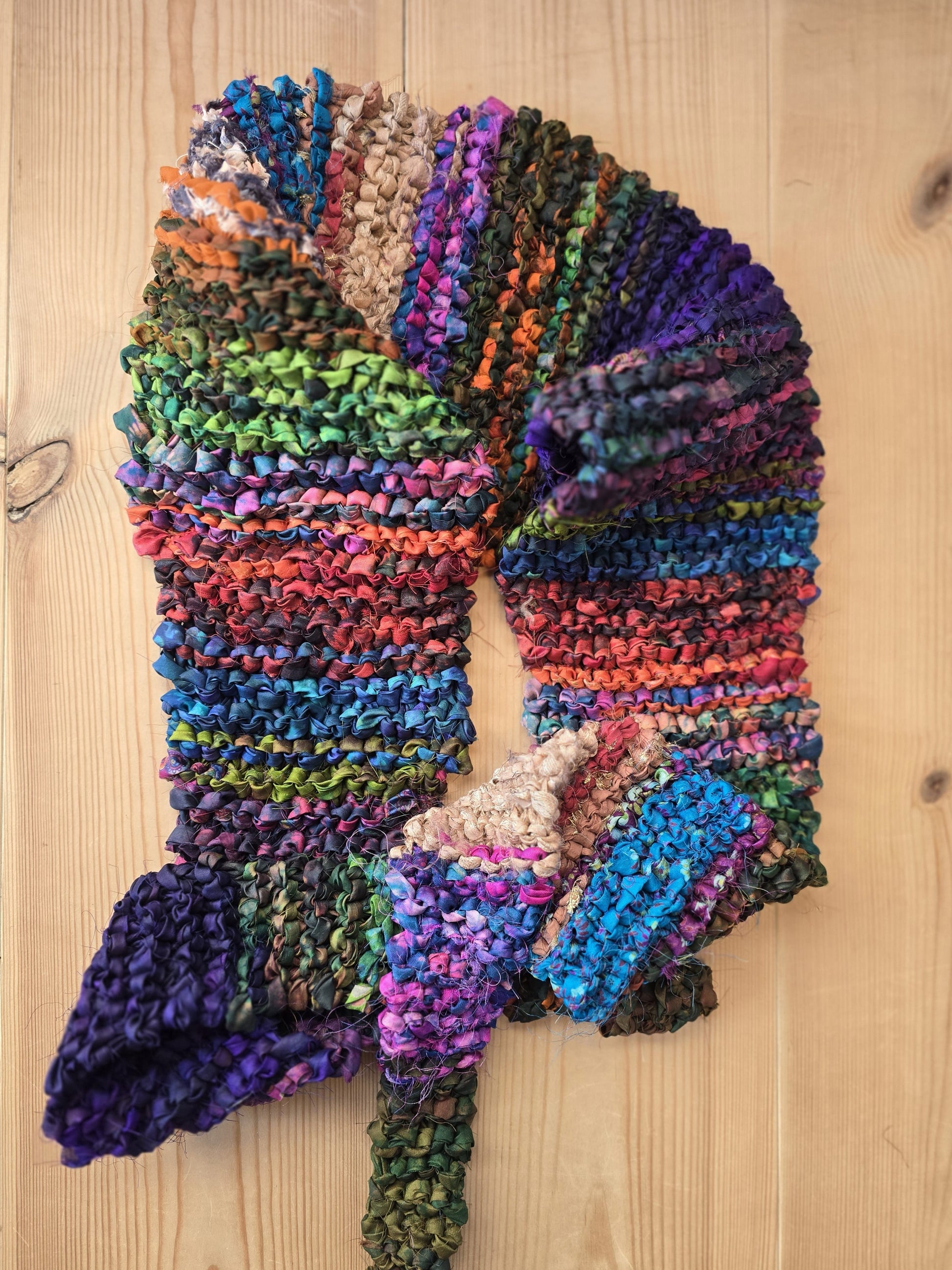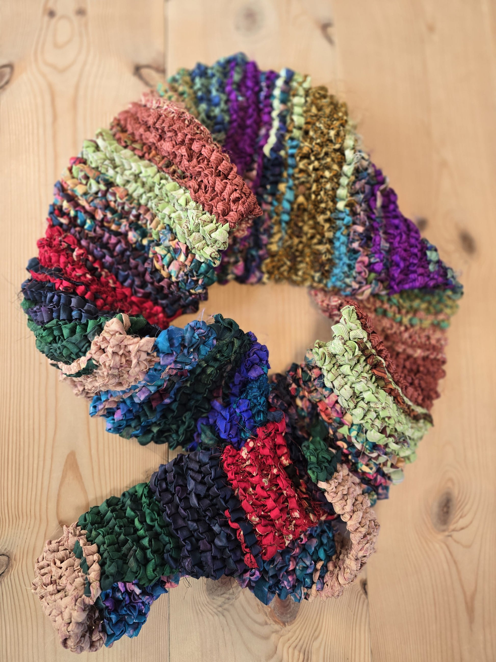 Disse tørklæder er håndstrikkede af strimler af silkestof. Stoffet er blevet til overs efter at silken er upcycled til andet tøj.