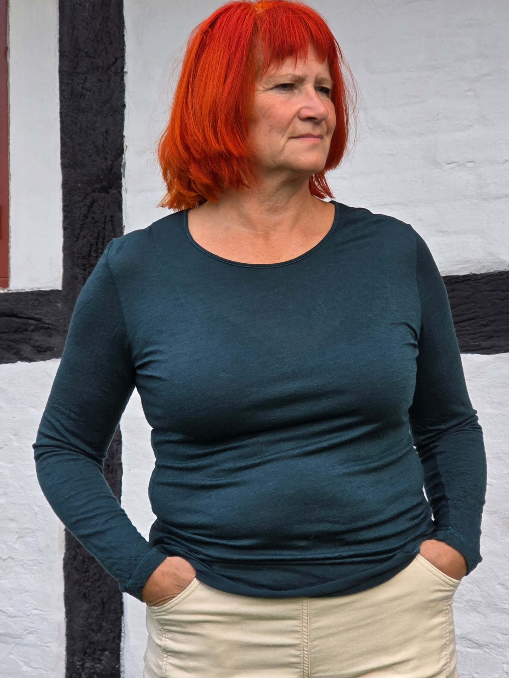 Brug den under bluser, trøjer og kjoler om vinteren og hold dig lun uanset hvad du ellers har på. Eller gør som her; til den smukke silkenederdel og så med en jakke eller vest over.