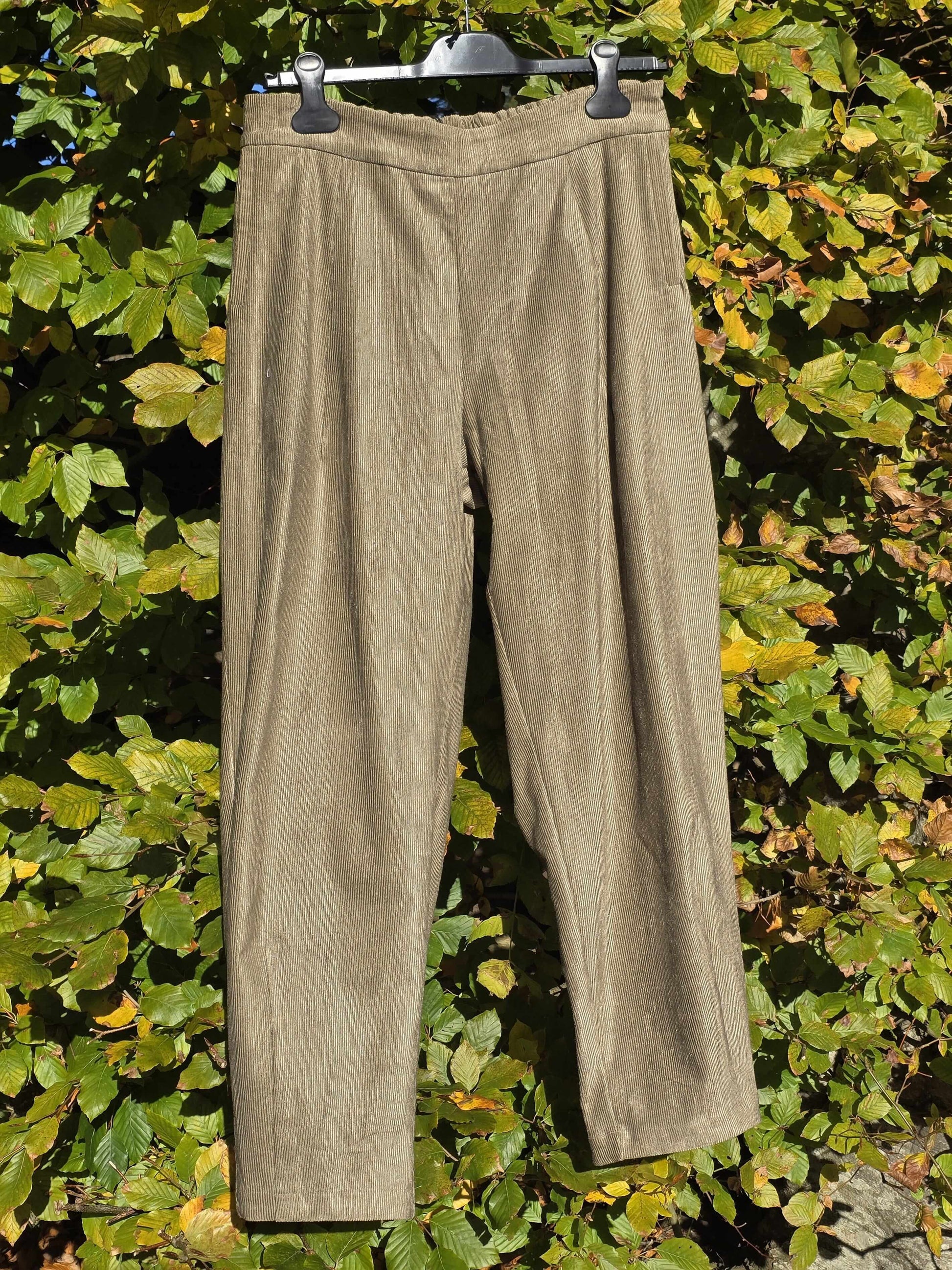 Bukserne har glat linning foran og elastik i taljen bagpå. Benene smaller en smule ind forneden og har behagelige skrålommer.