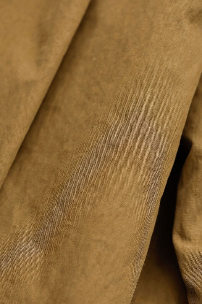 Ydermaterialet, der er valgt til frakken, har en rar overflade og består af 46% bomuld og 54% polyamid. Frakken er mellemfoeret med 3M Thinsulate CS70, som er et microfiber materiale, der effektivt varmer kroppen op med ens egen kropsvarme uden at fylde eller veje for meget. Thinsulate bruges f.eks. også i skitøj og flyvedragter. Inderst er frakken foeret med foer af 100% bomuld og 100% acetat satin i ærmerne. Yderstoffet er produceret i Italien, mens frakken er syet i Bulgarien.