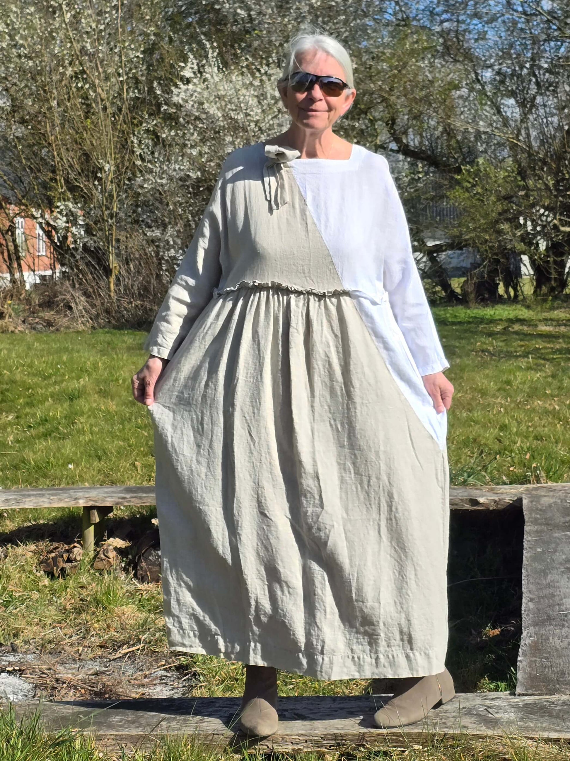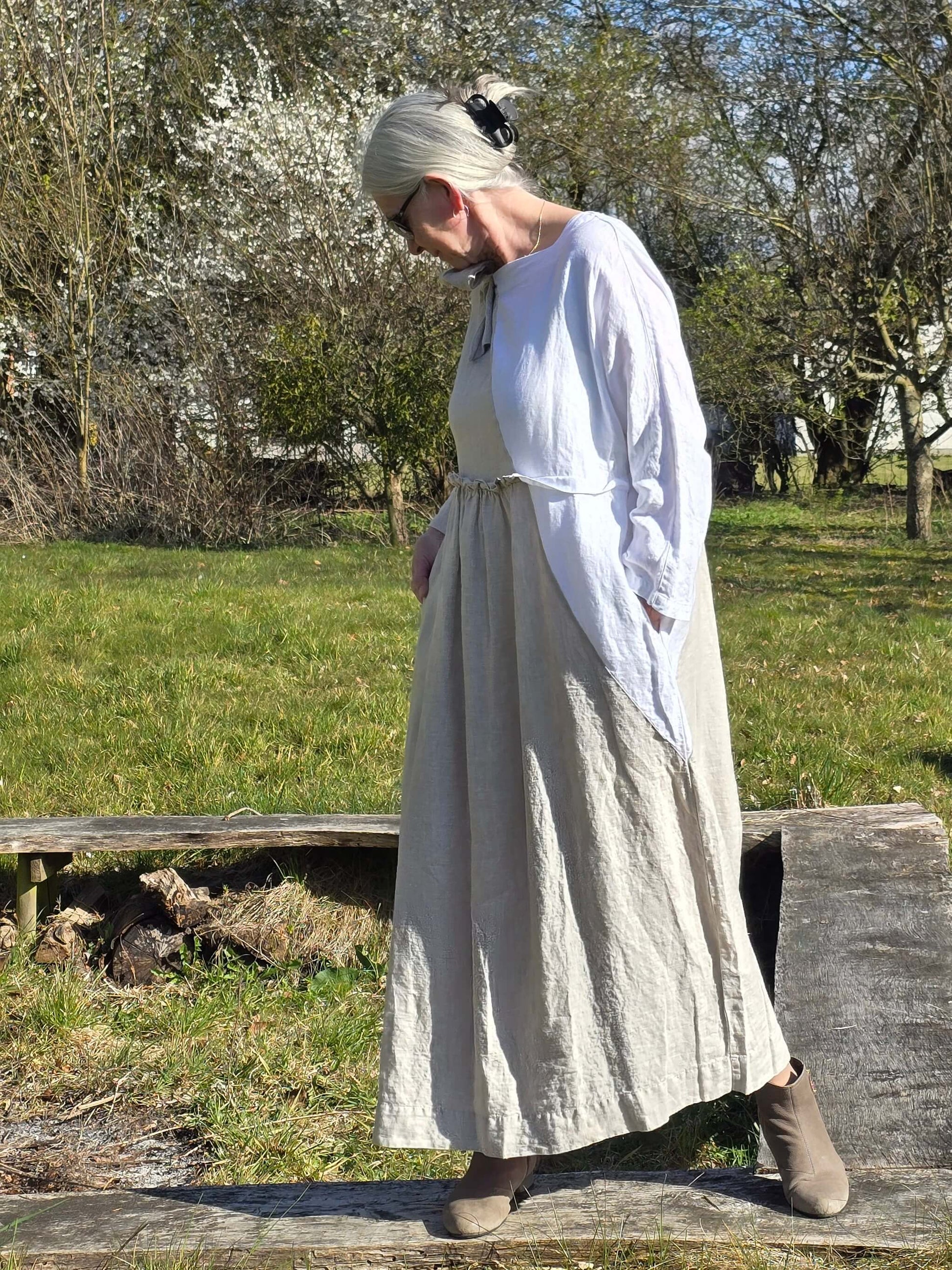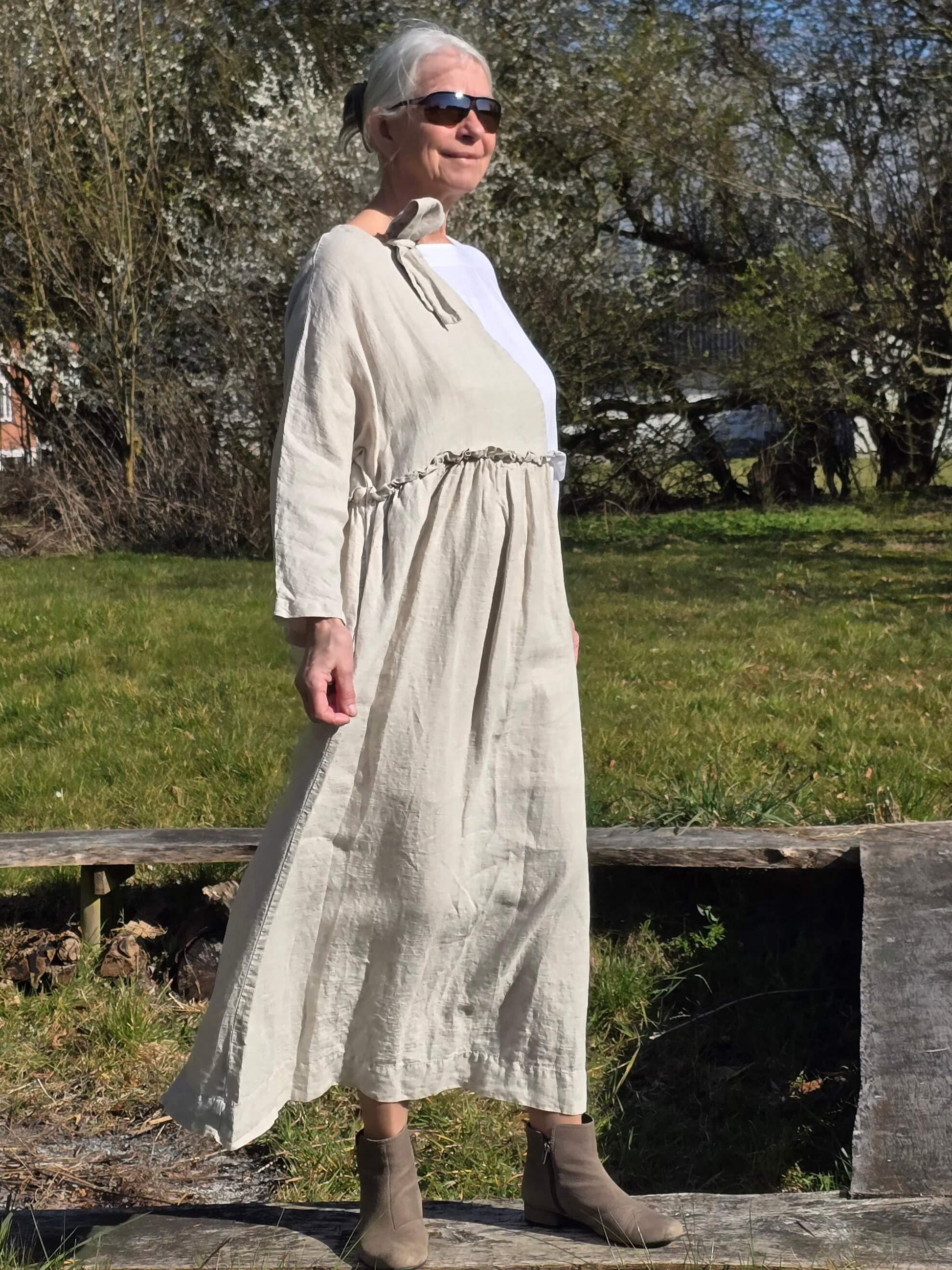 Lang, romantisk kjole i ren hør. Nederdelen er sat på med en stofflæse og en sløjfeagtigt detalje ved halsen