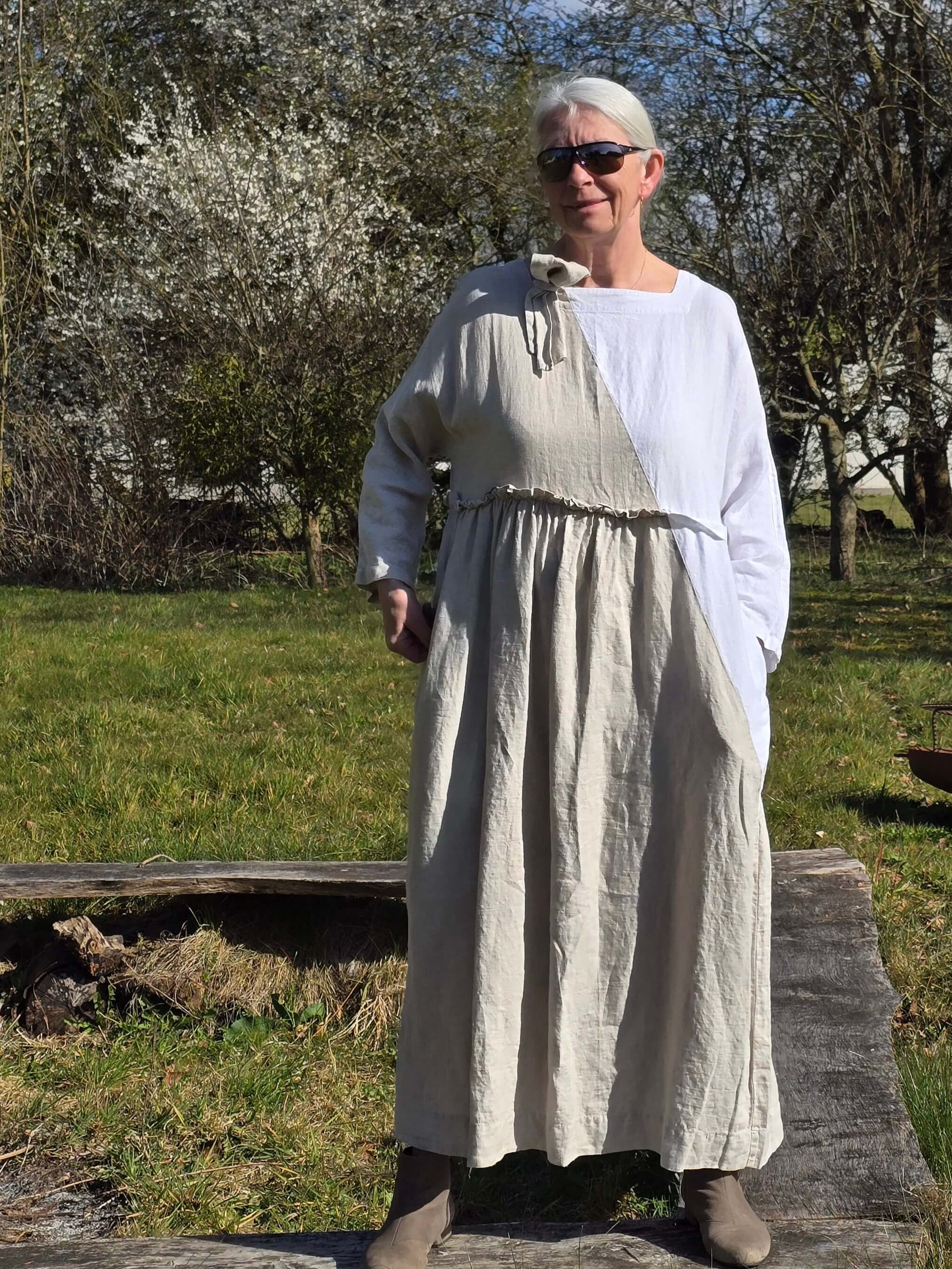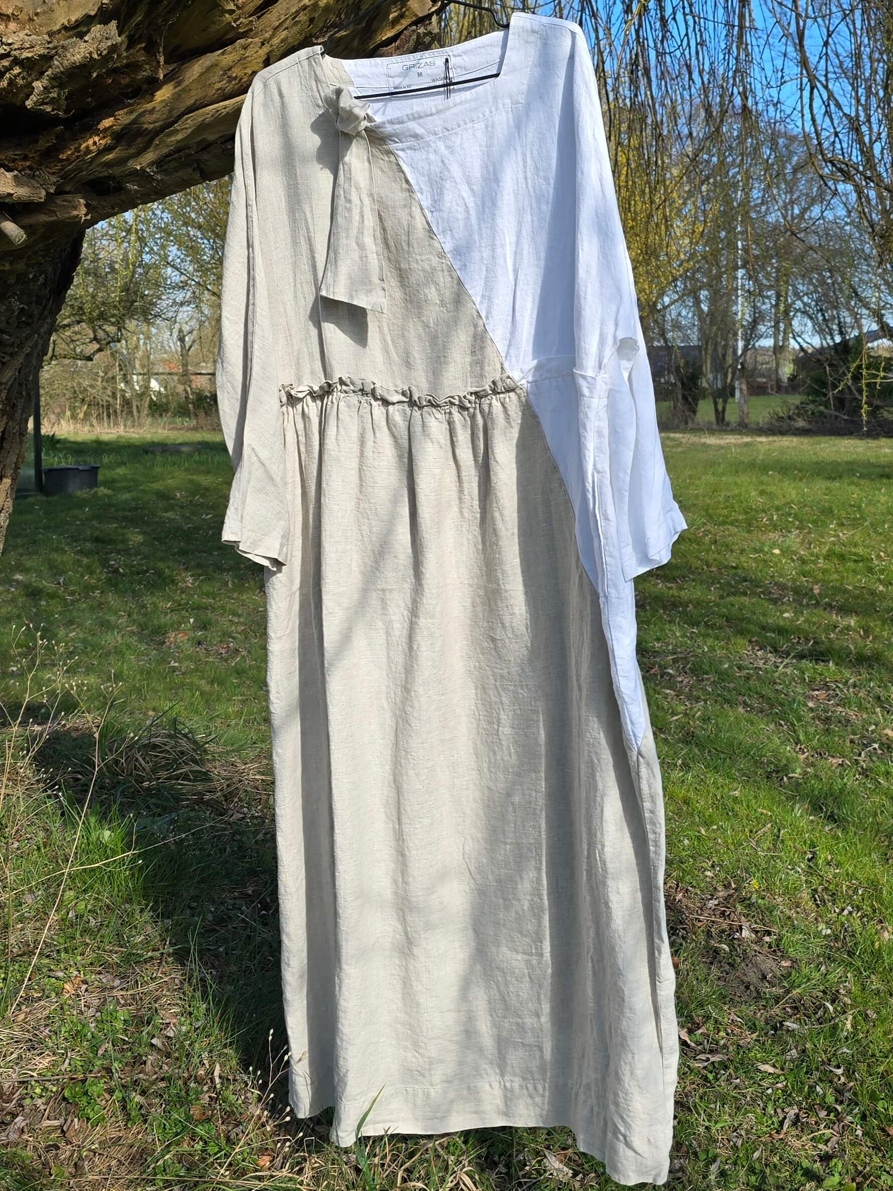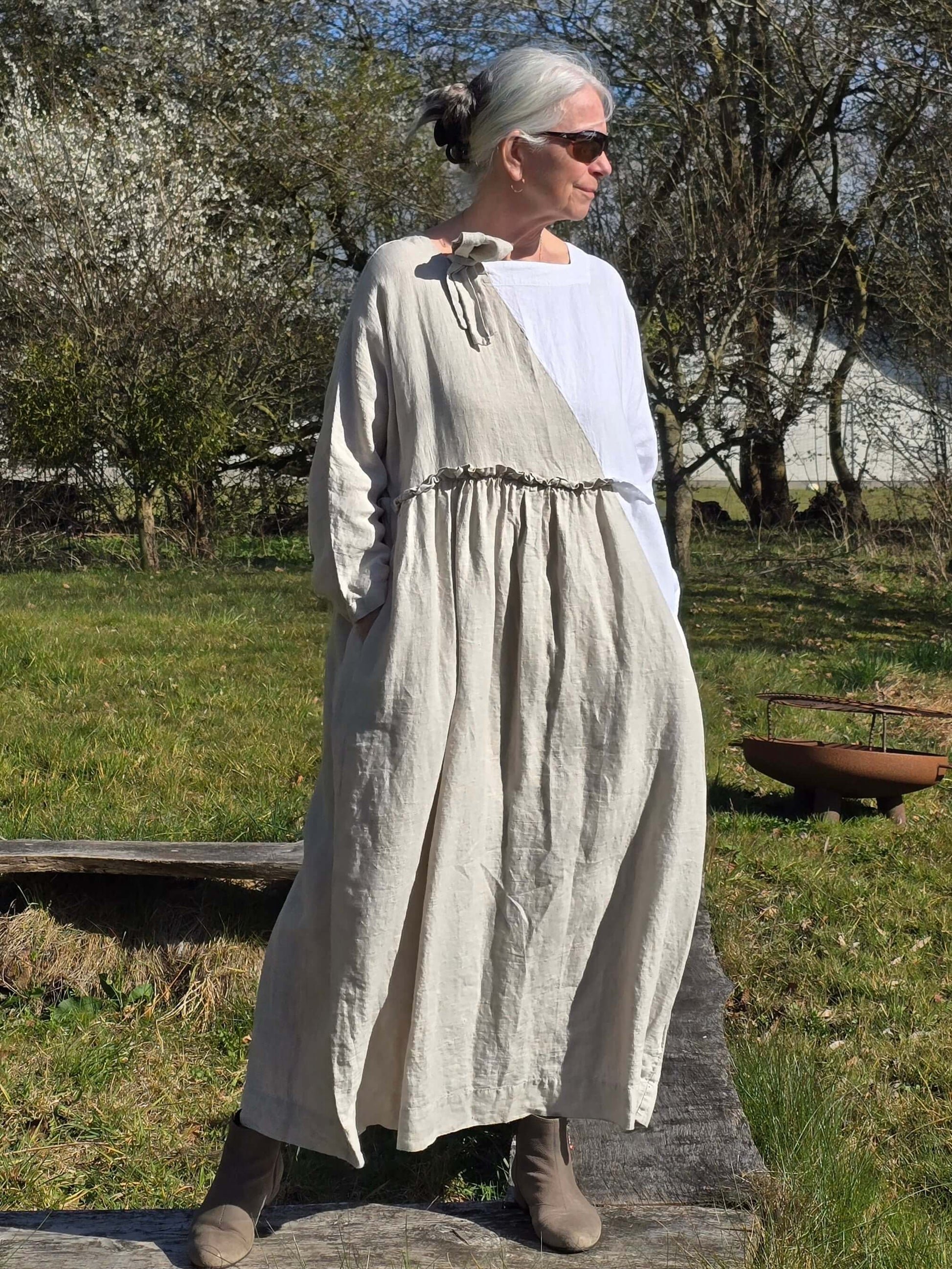 Lang, romantisk kjole i ren hør. Nederdelen er sat på med en stofflæse og en sløjfeagtigt detalje ved halsen