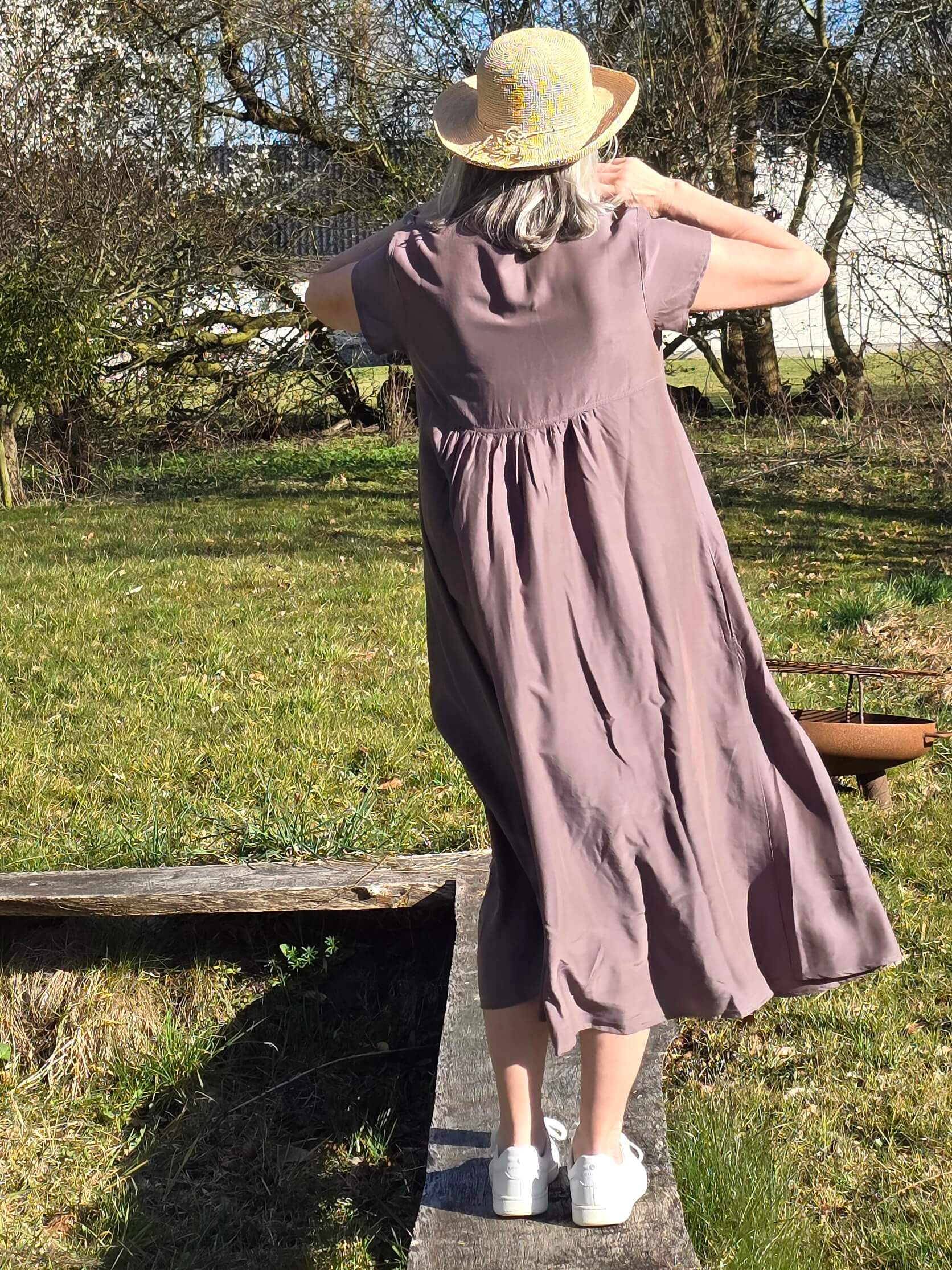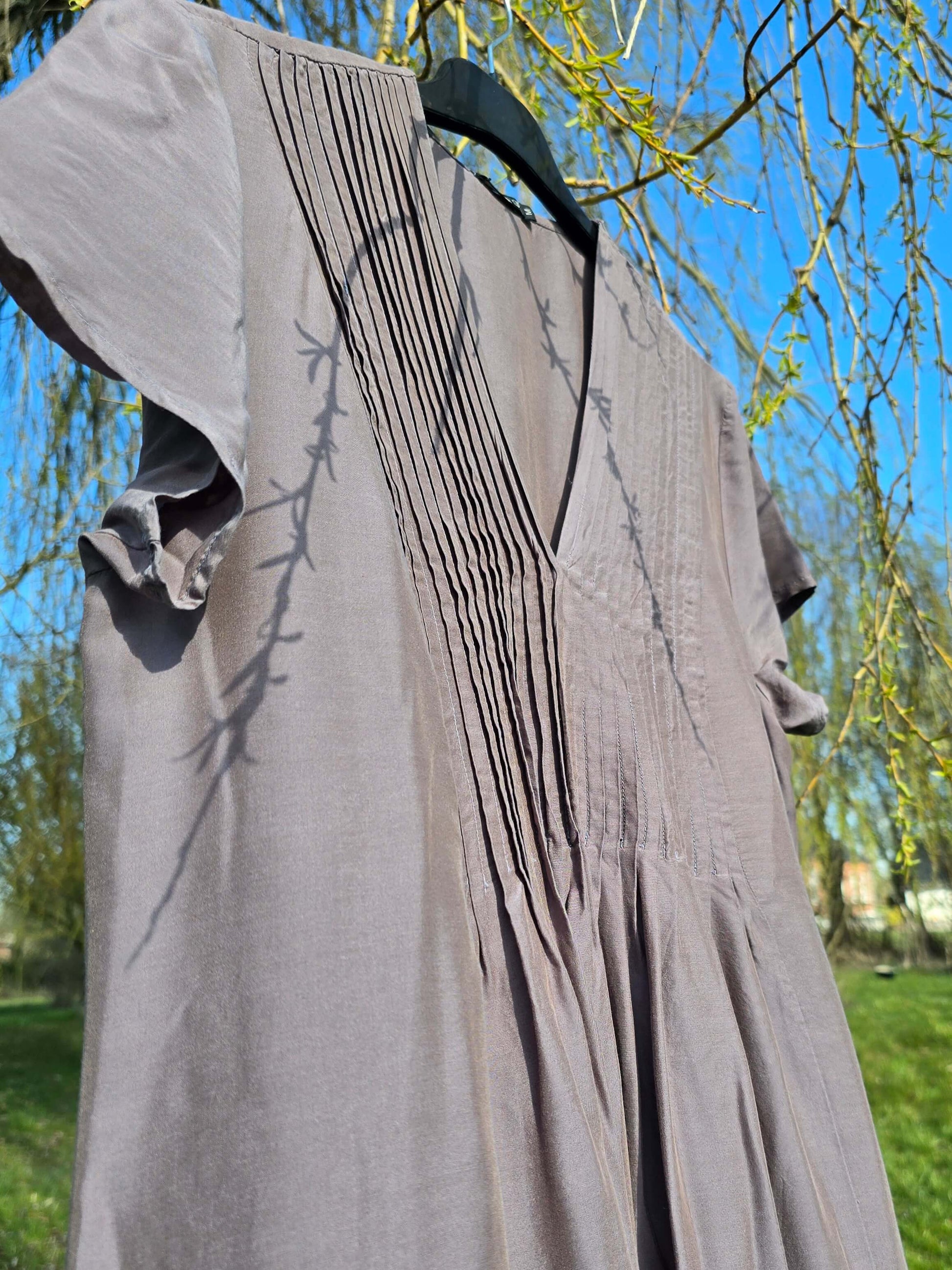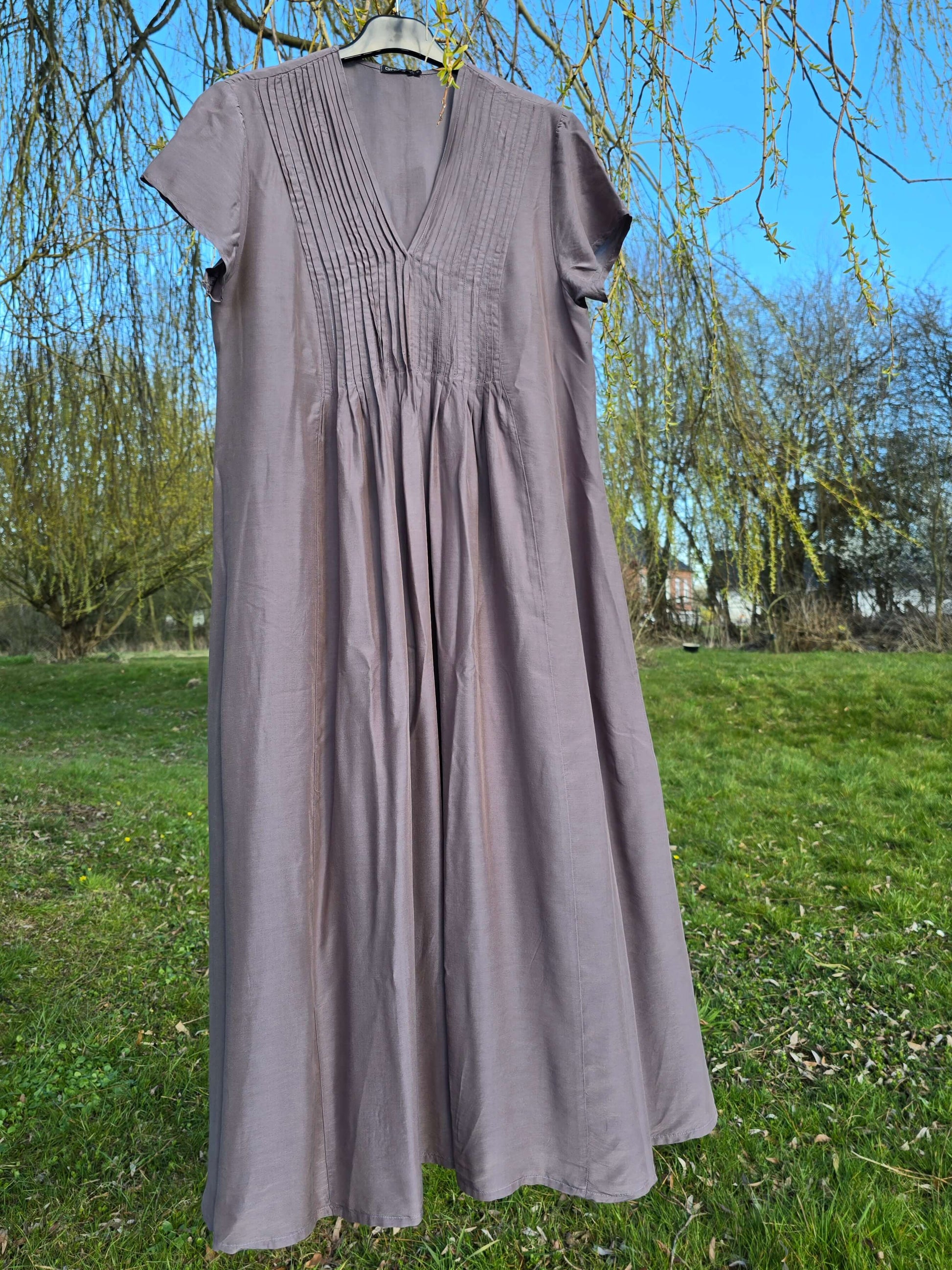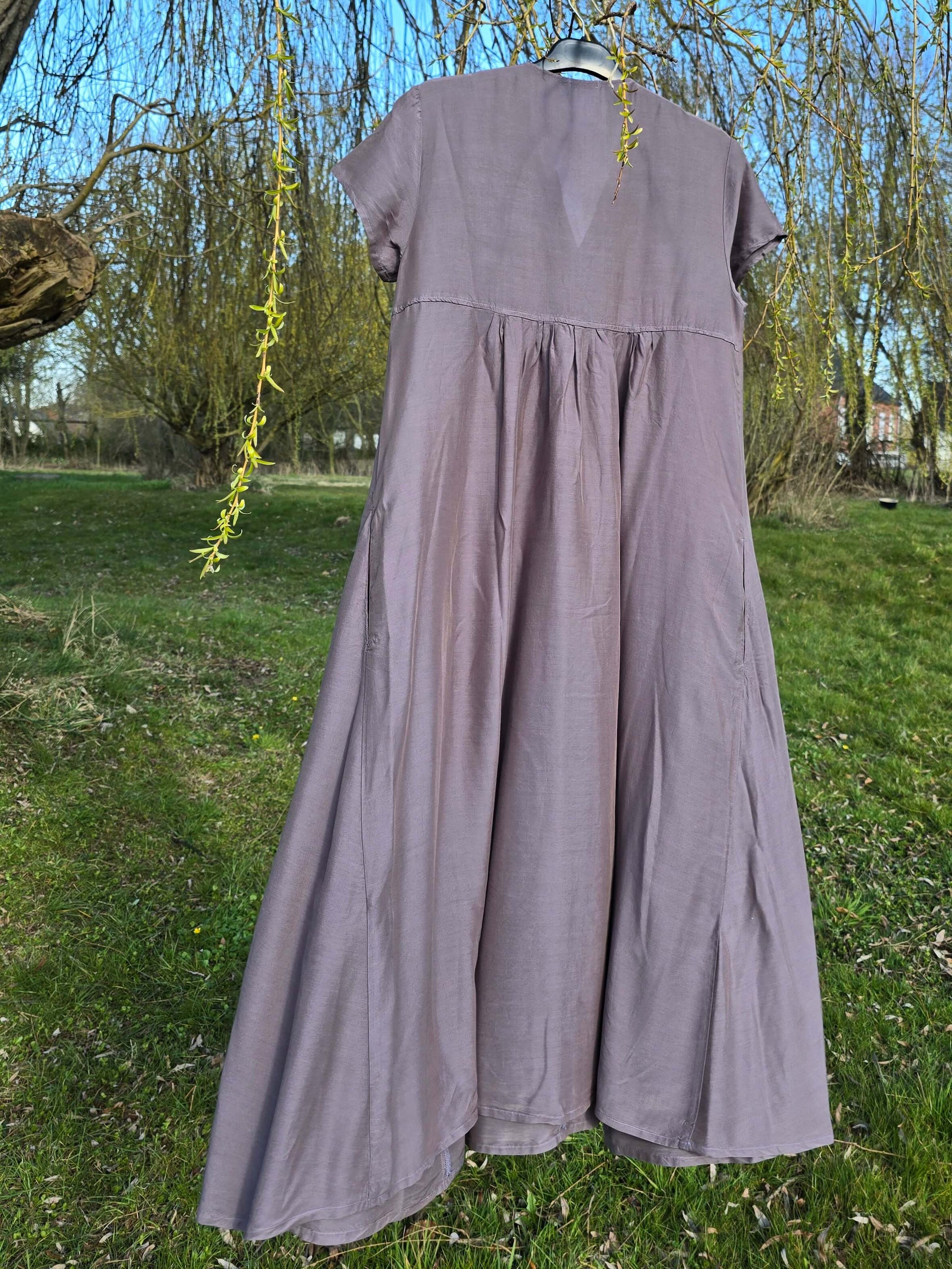 Blød og let, elegant og smuk kjole, med bieser foran og lidt rynk indsat på overskæringen bagpå, for ekstra vidde.