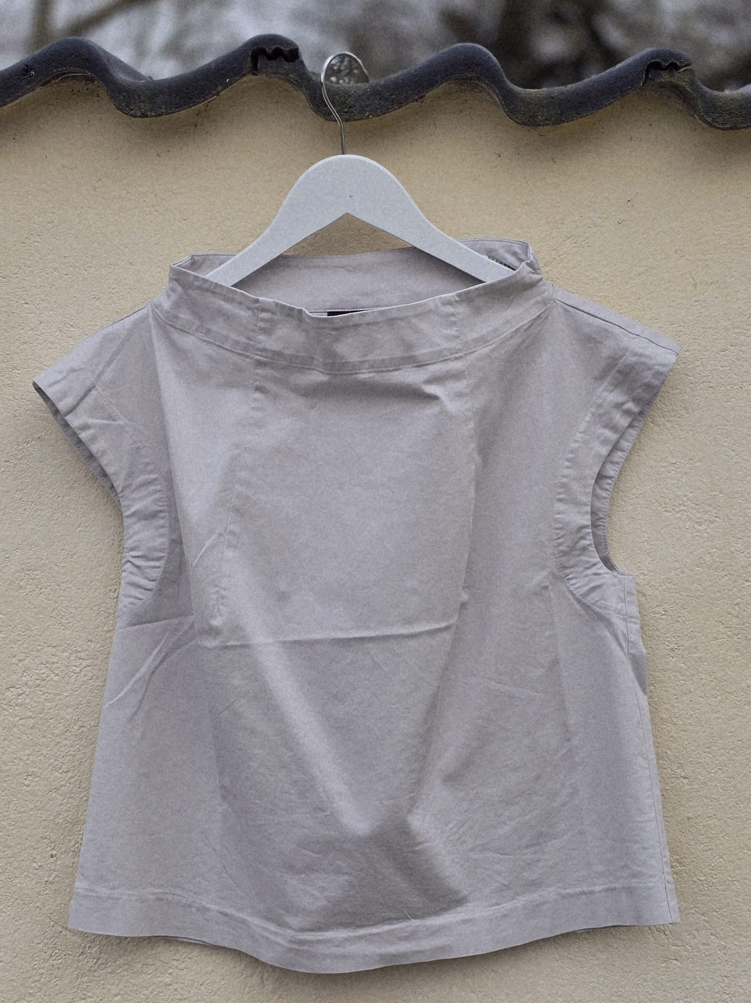 Denne top, model EA, er en sjov og elegant sommerbluse. Kraven står flot i bådfacon, de små vingeærmer dækker lige skuldrene og ærmegabene er med en bred belægning så de holder den gode facon.