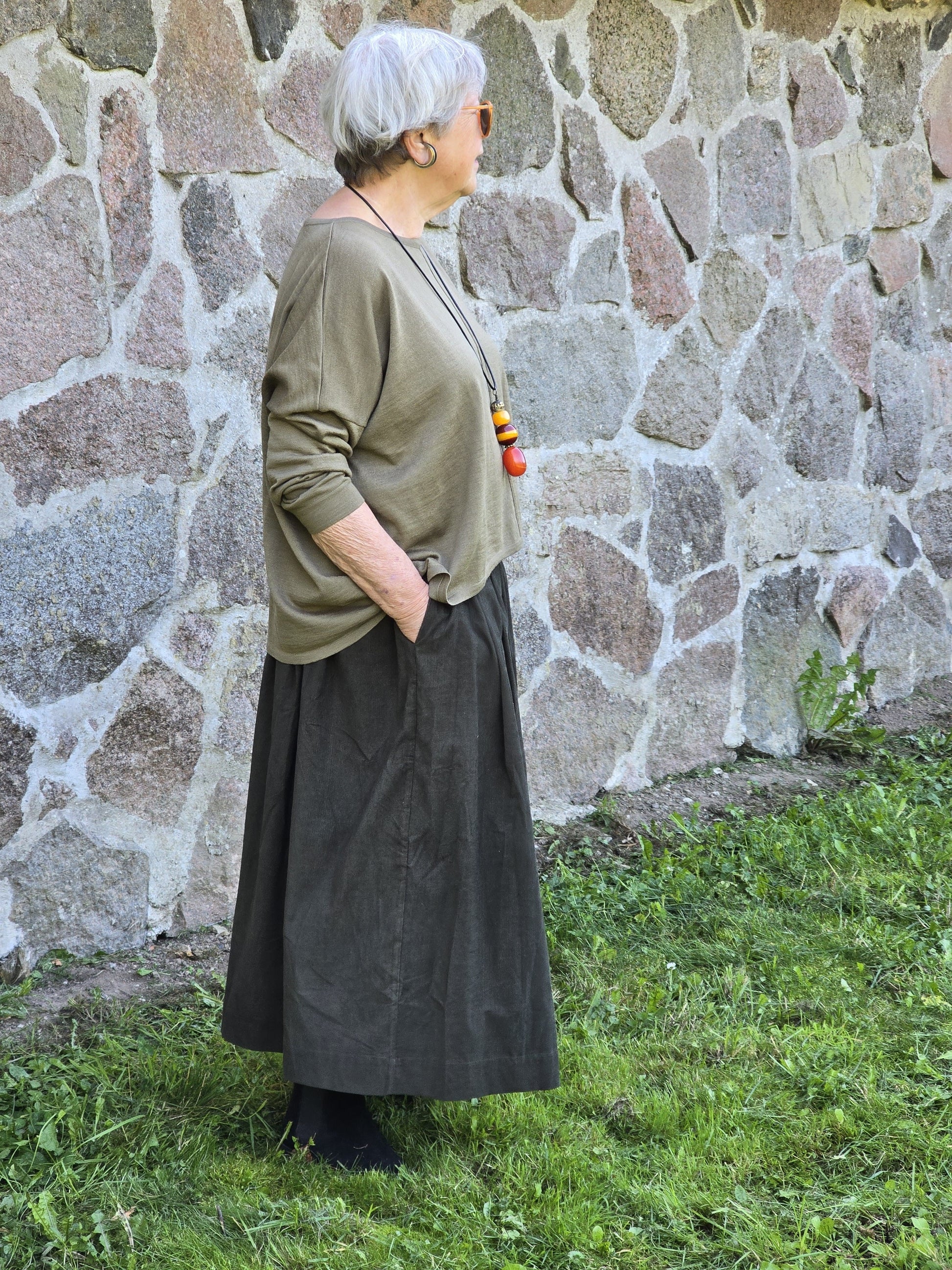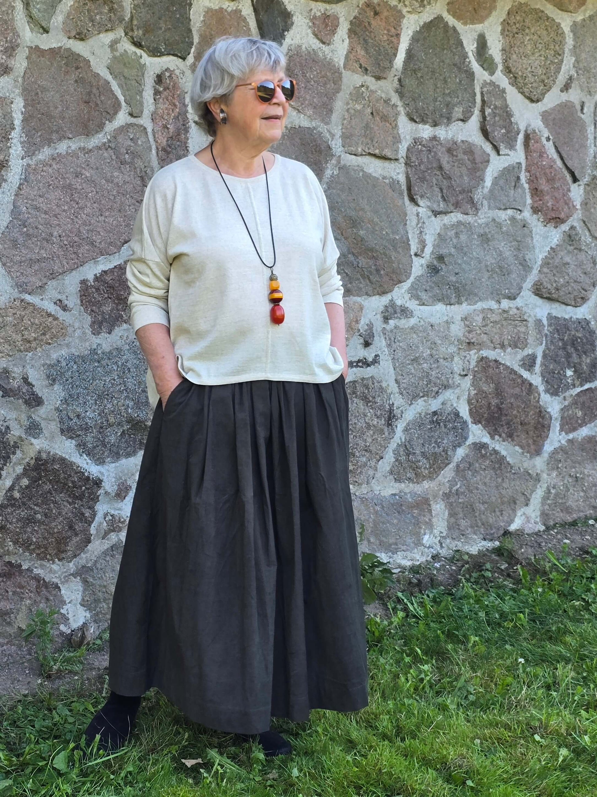 Fra det danske firma Grobund kommer denne klassiske nederdel med rynk hele vejen rundt, elastik i ryggen og fast linning foran.