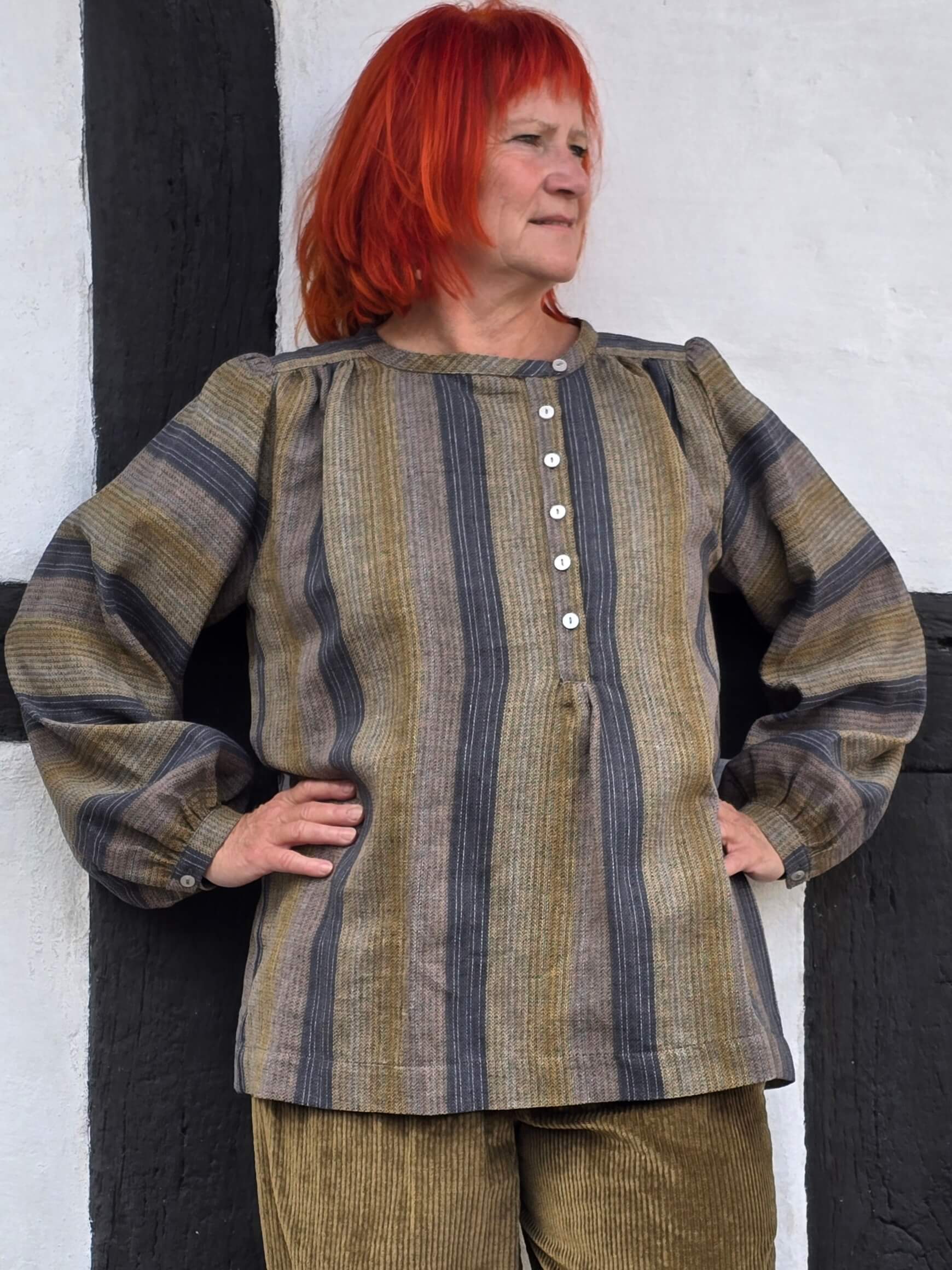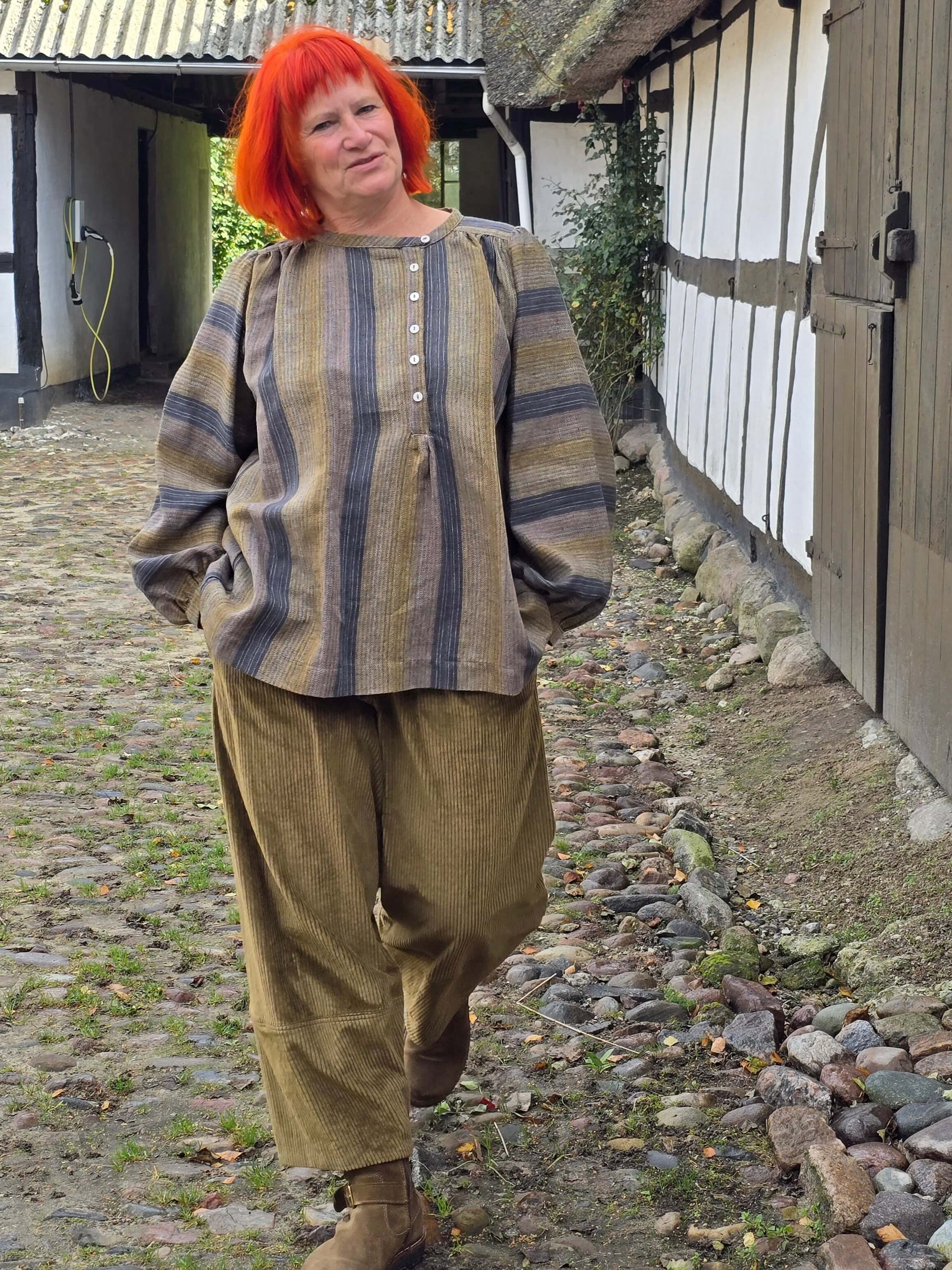 Cool stribet tunikabluse i hør/bomulds-stof med en flote og eksklusiv struktur. Skjorten er i gyldne og blå grå striber.