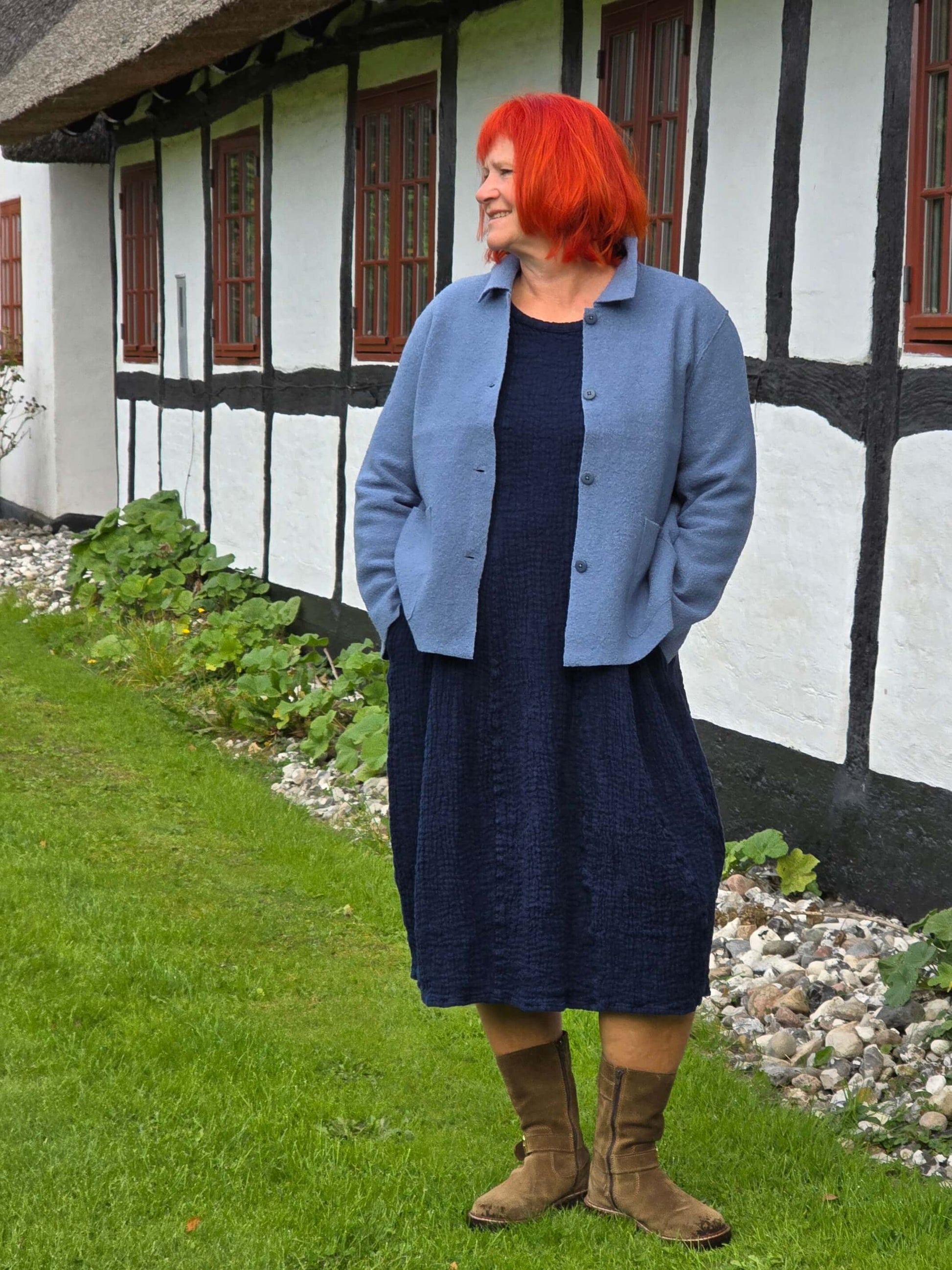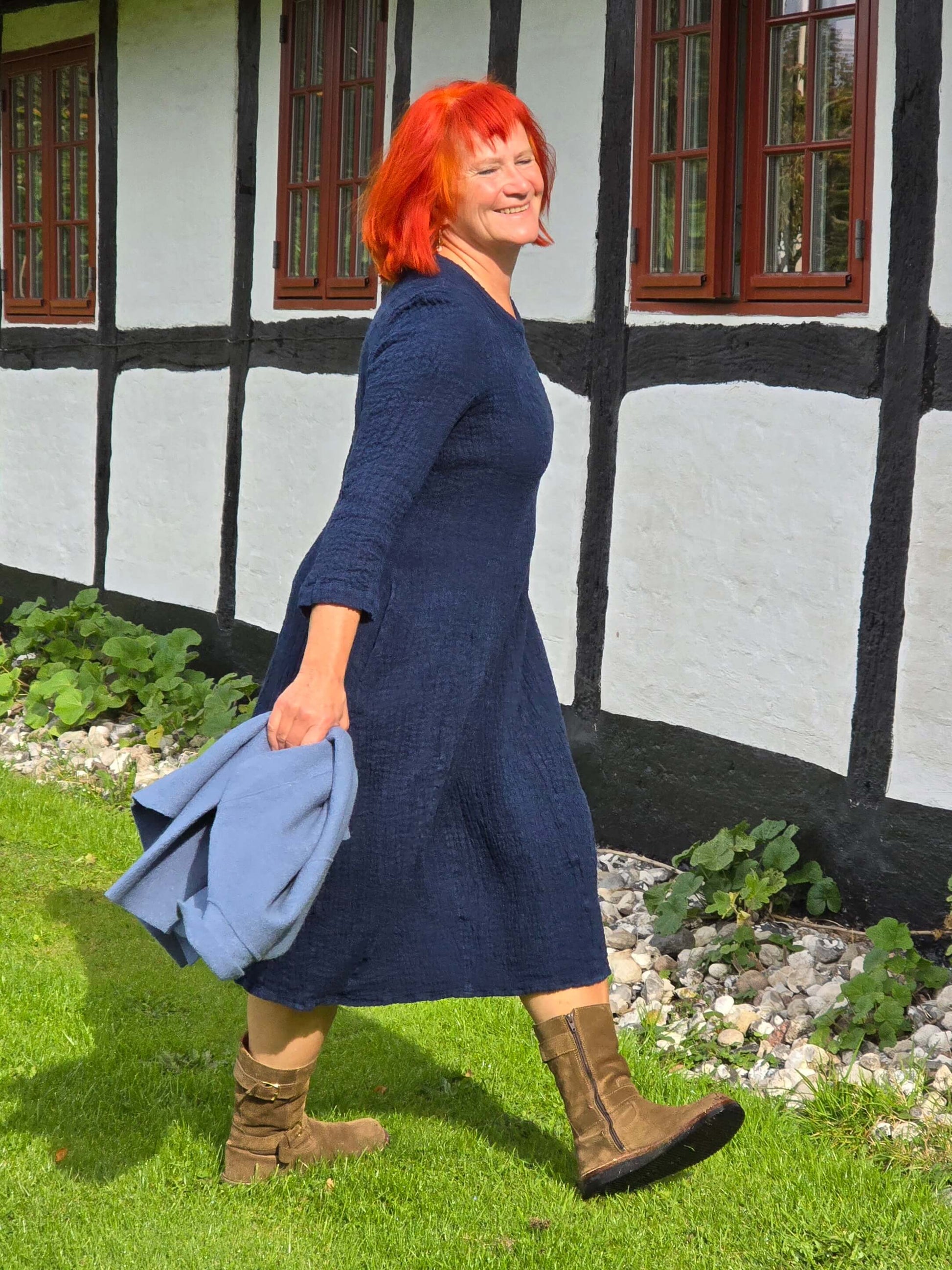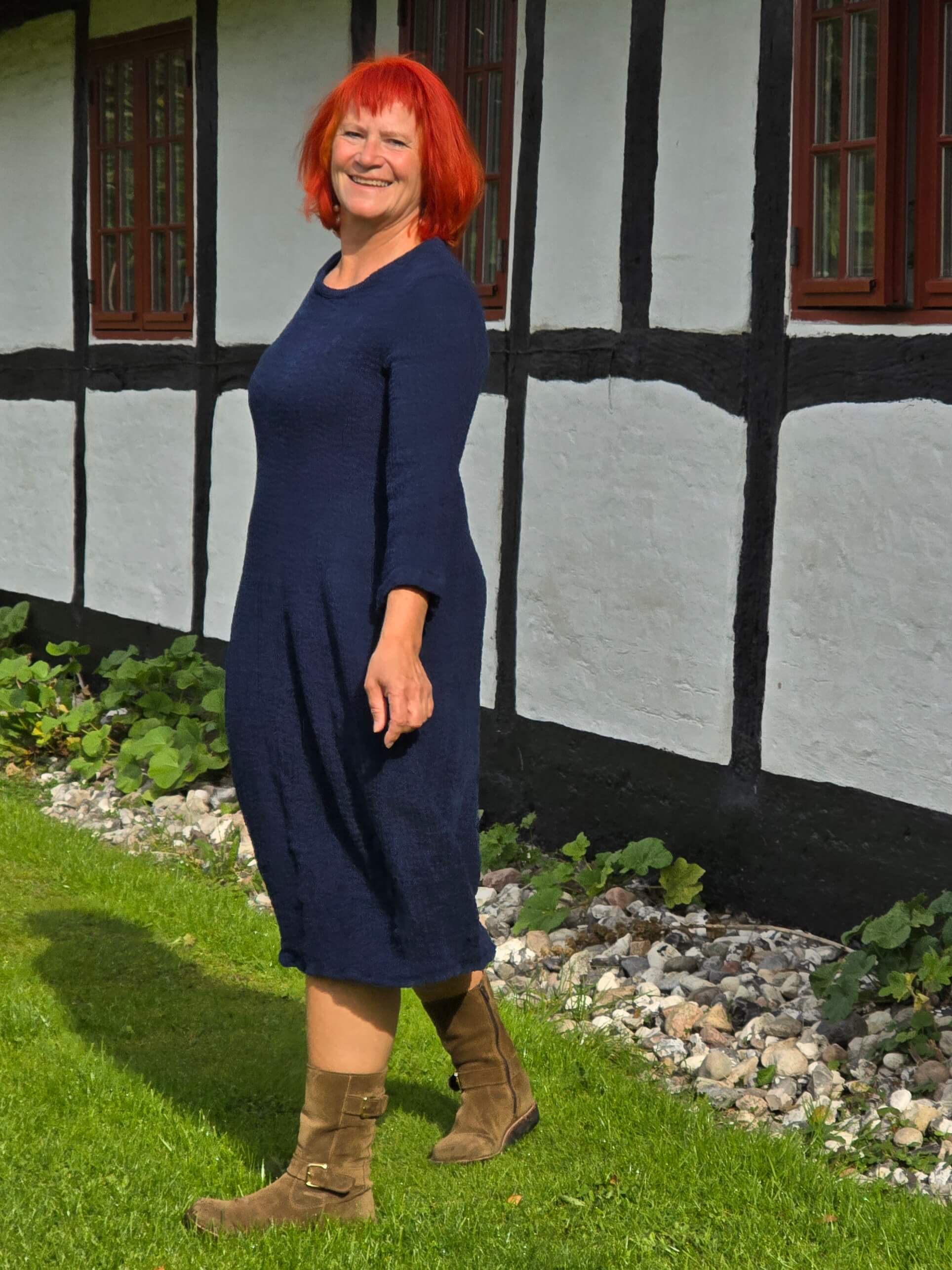 Denne model er en klassiker fra Grizas. Kjolen er syet i baner så den smaller fint ind ved taljen uden at sidde helt til og former så nederdelen let, som en ballon. Stoffet er tykt, blødt og elastisk p.g.a. vævningen. En en lun og hyggelig kjole til kølige dage og samtidig kan den snildt styles op med kulørte tørklæder, en lille jakke eller et rustikt smykke. Og så vi må ikke glemme de gode lommer i sidesømmene, som man kan lune hænderne i.