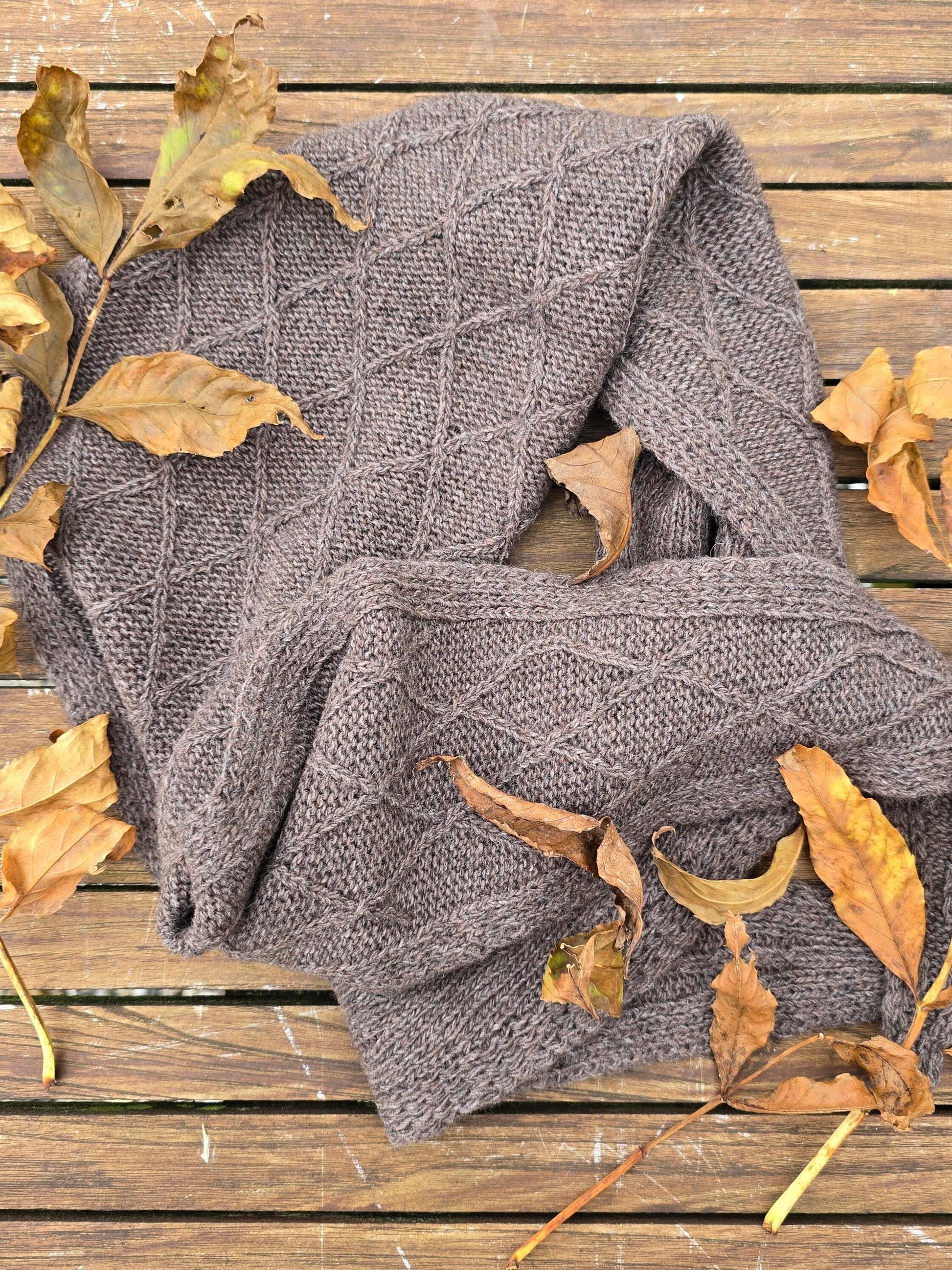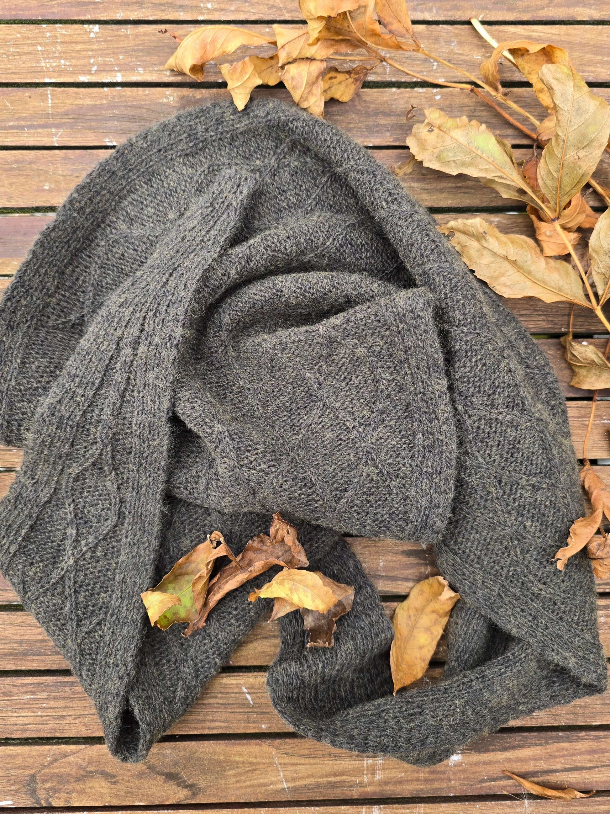 Strikmønstret er meget smukt med snoninger og rib på langs i kanterne.