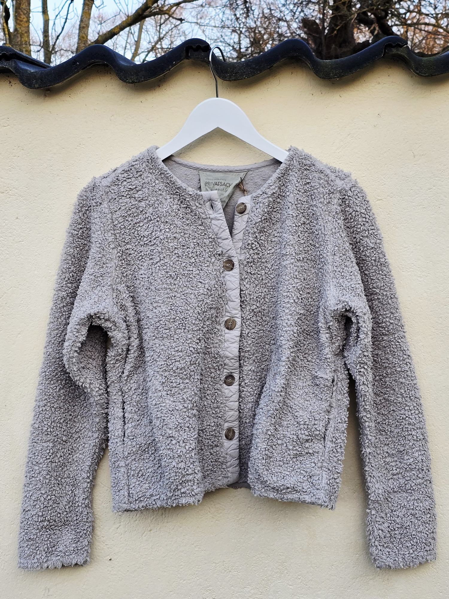 Cardigan med råt udtryk. Materialet er økologisk bomuld, strikket med en slags Rya teknik så den får en overflade der minder om gamle teddybjørne.