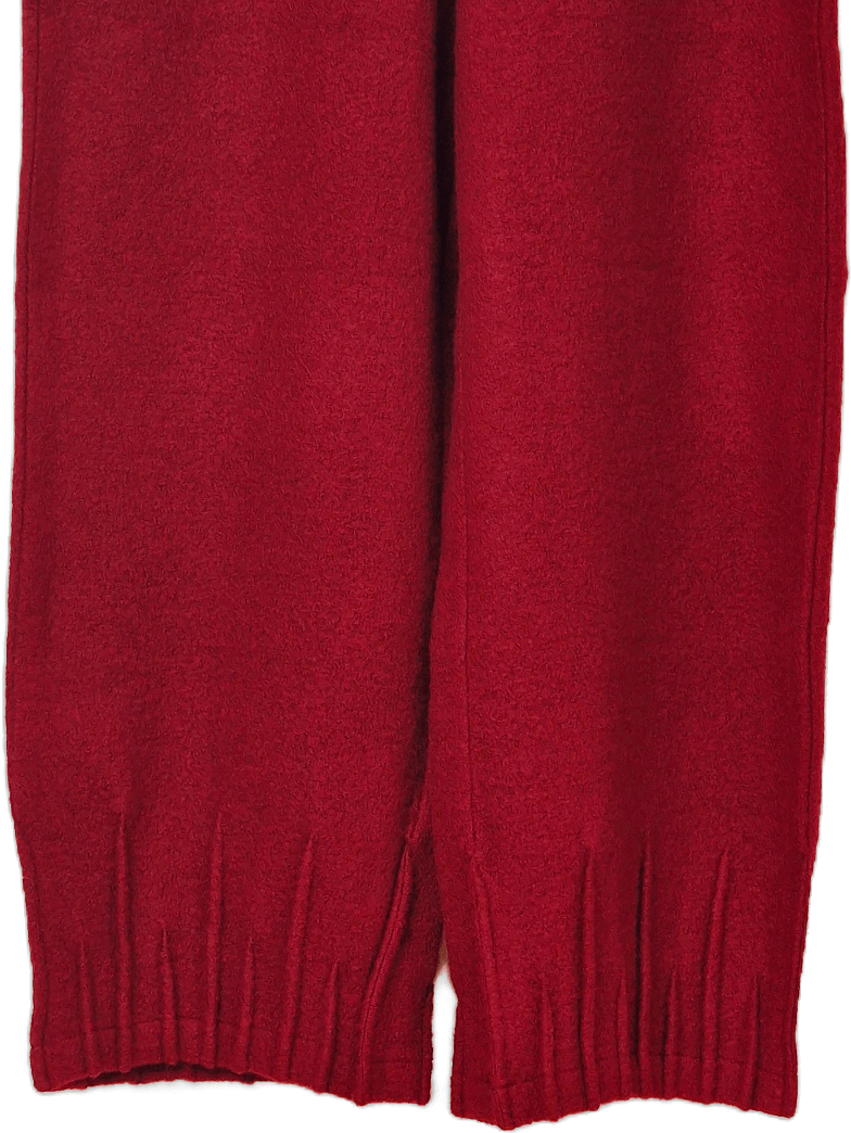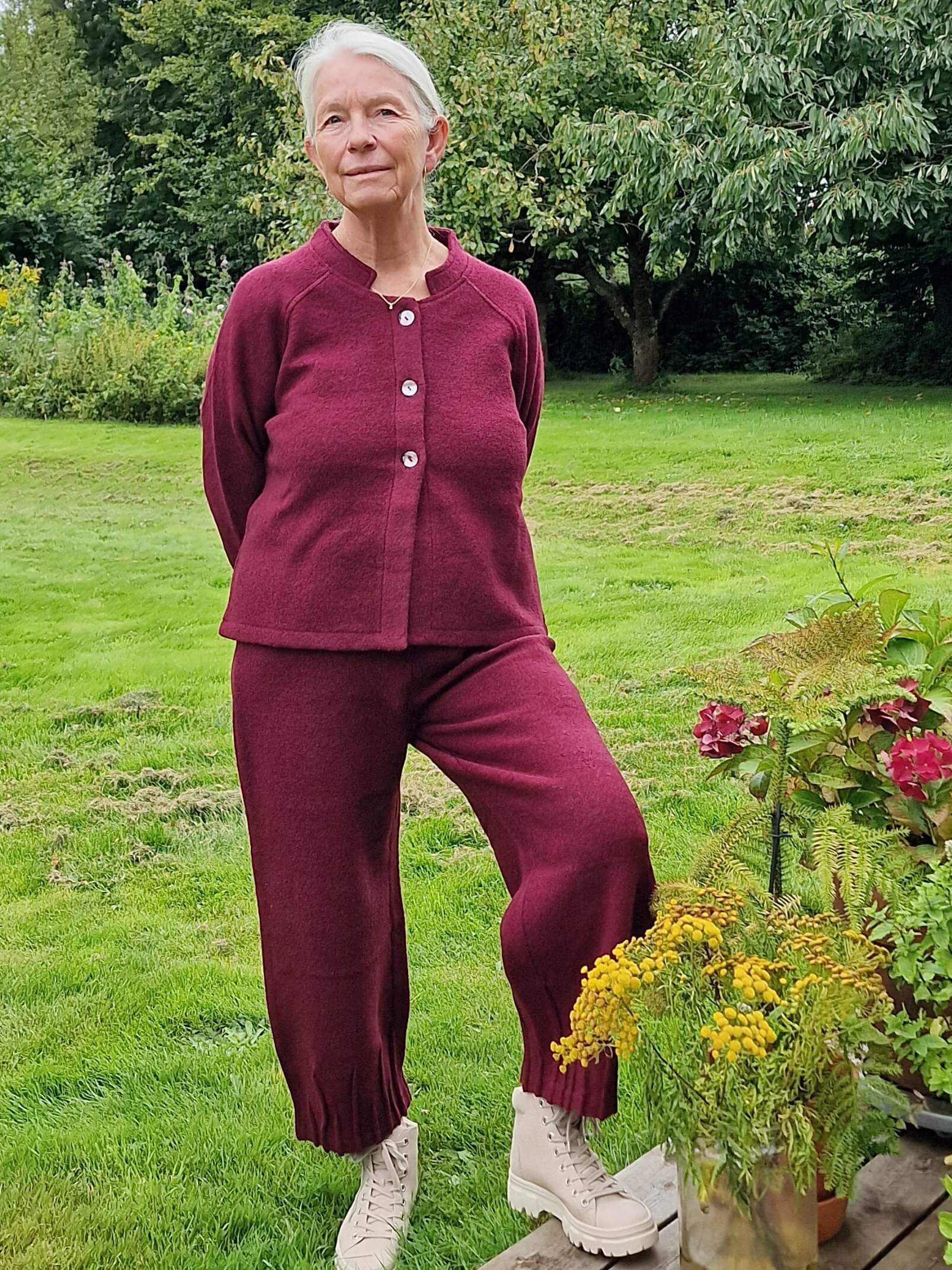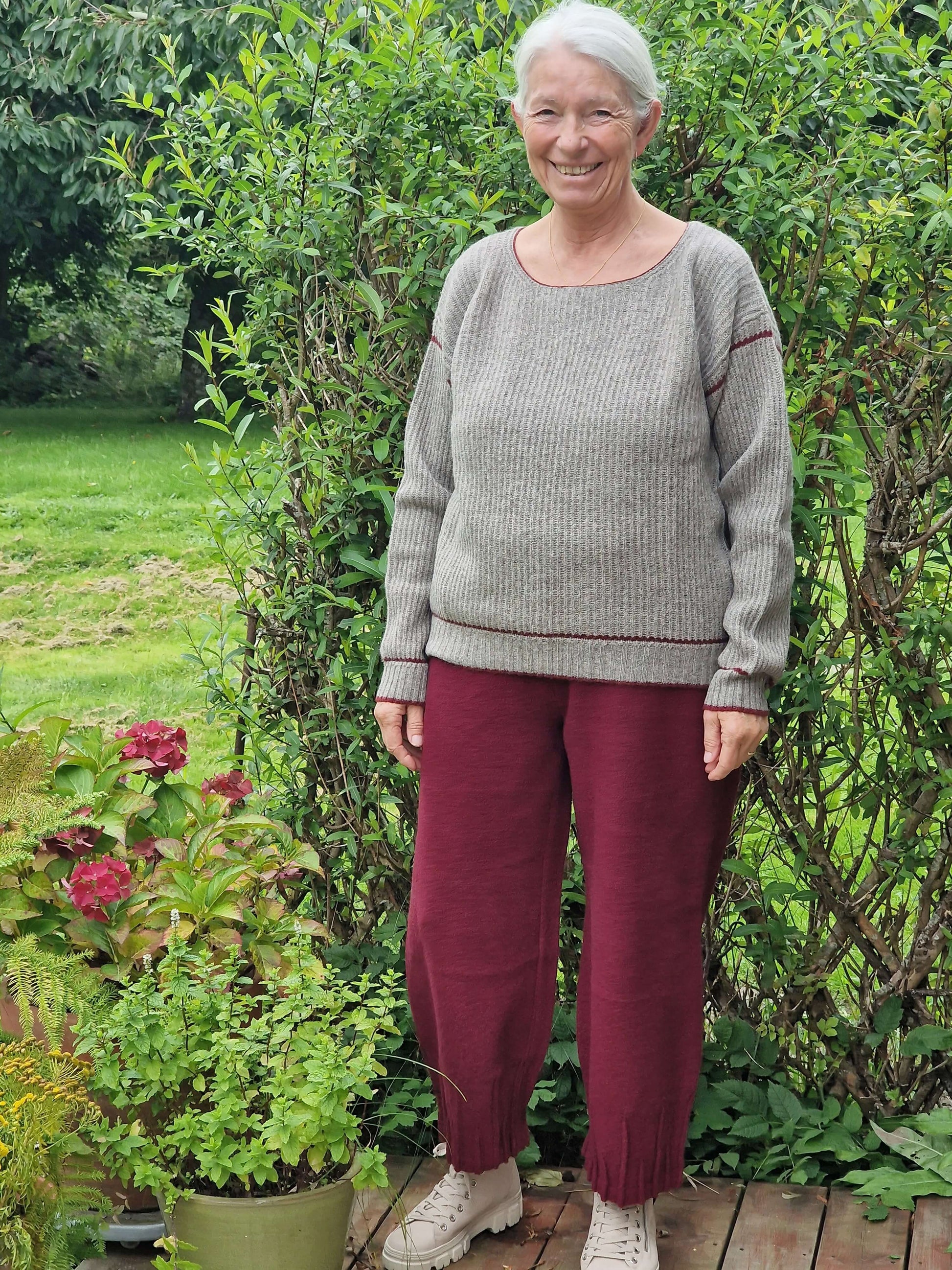 Ankellange bukser i en dejlig kvalitet af strikket, kogt uld som har en blød overflade. Materialet er fast med kun lidt stræk, som gør at bukserne holder deres facon pænt. Nederst er der syet en række udvendige læg som gør, at benene runder lidt ind forneden. Bukserne har hverken lommer eller bæltestropper, hvilket ville blive for tykt. Der er elastik i linningen, men ikke mange rynker, bukserne sidder pænt til.