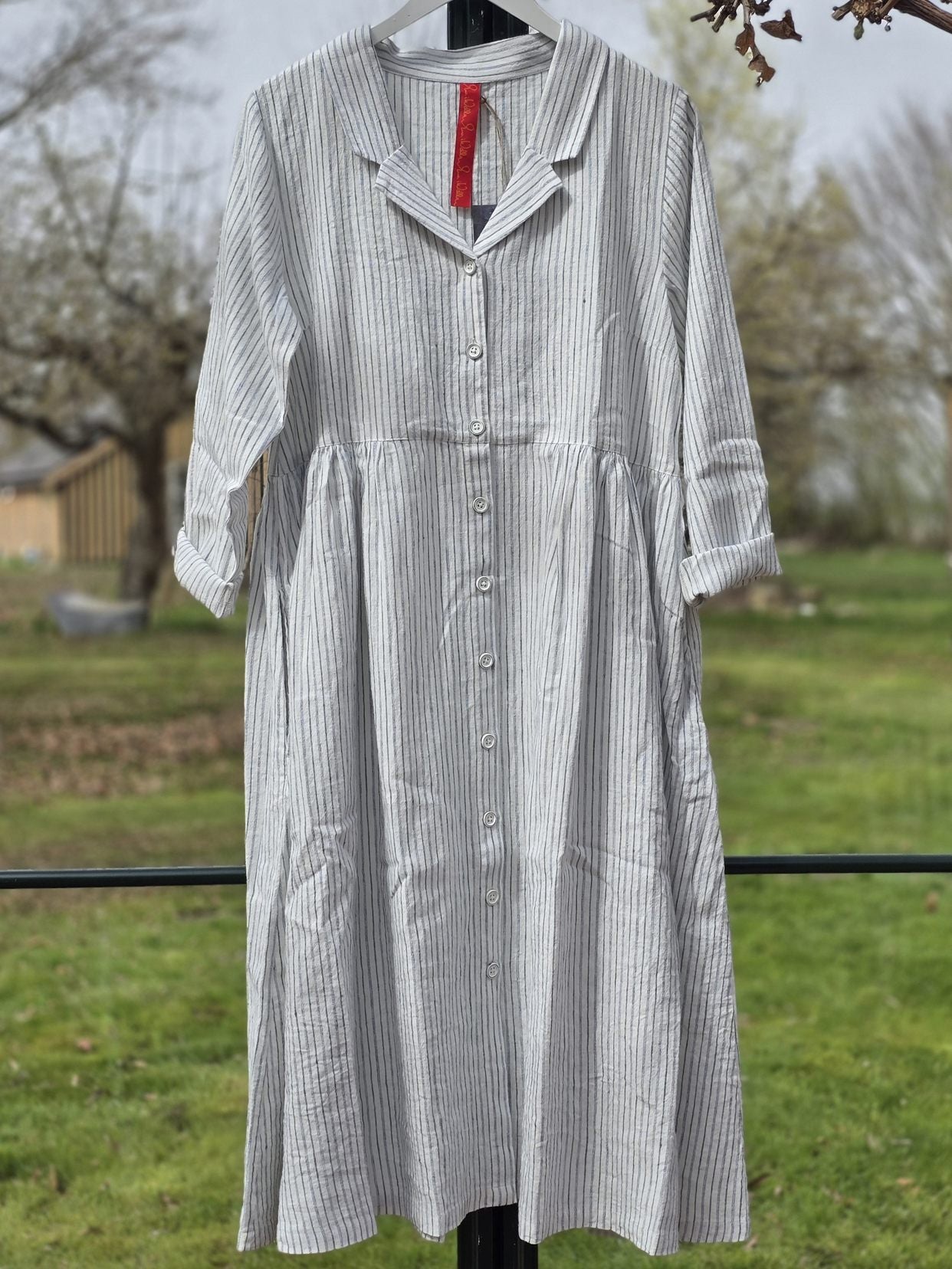 Langærmet hørkjole i midi længde, med reverskrave og knaplukning foran. Den let krøllede nederdel giver en smuk fylde, og lommerne i sidesømmene understreger den afslappede stil.