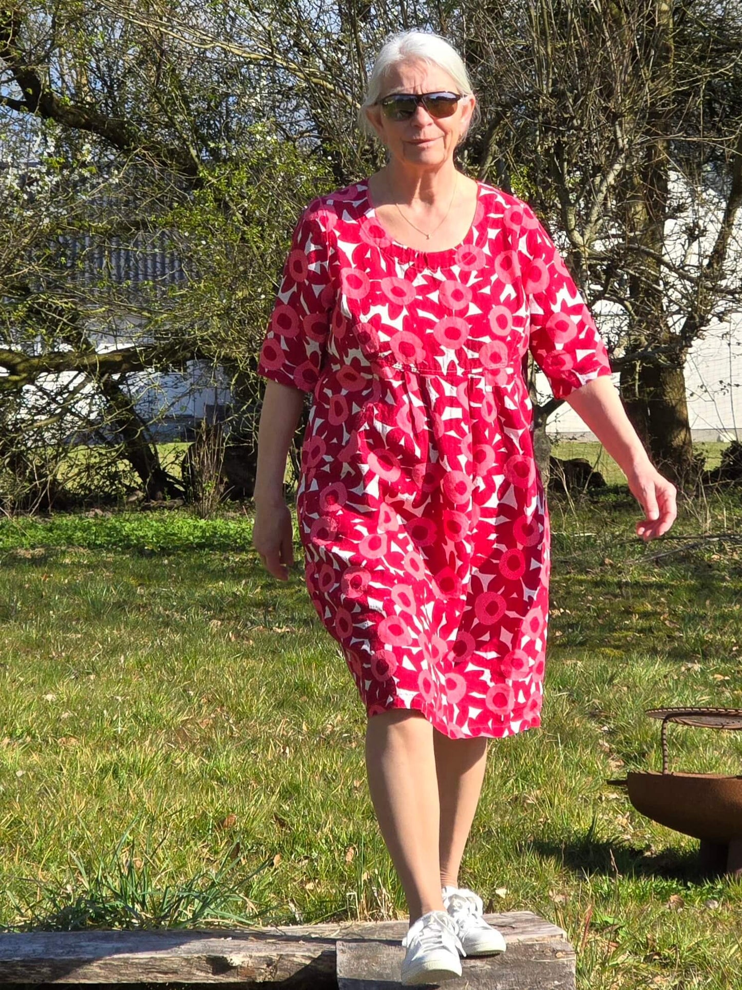 Denne kjole har rund hals, 3/4 ærmer og let ballonformet nederdel. Den er skåret over lige over taljen og tilføjet en smule rynk for mere rummelighed. Lommerne er fint placeret i en skrå overskæring.